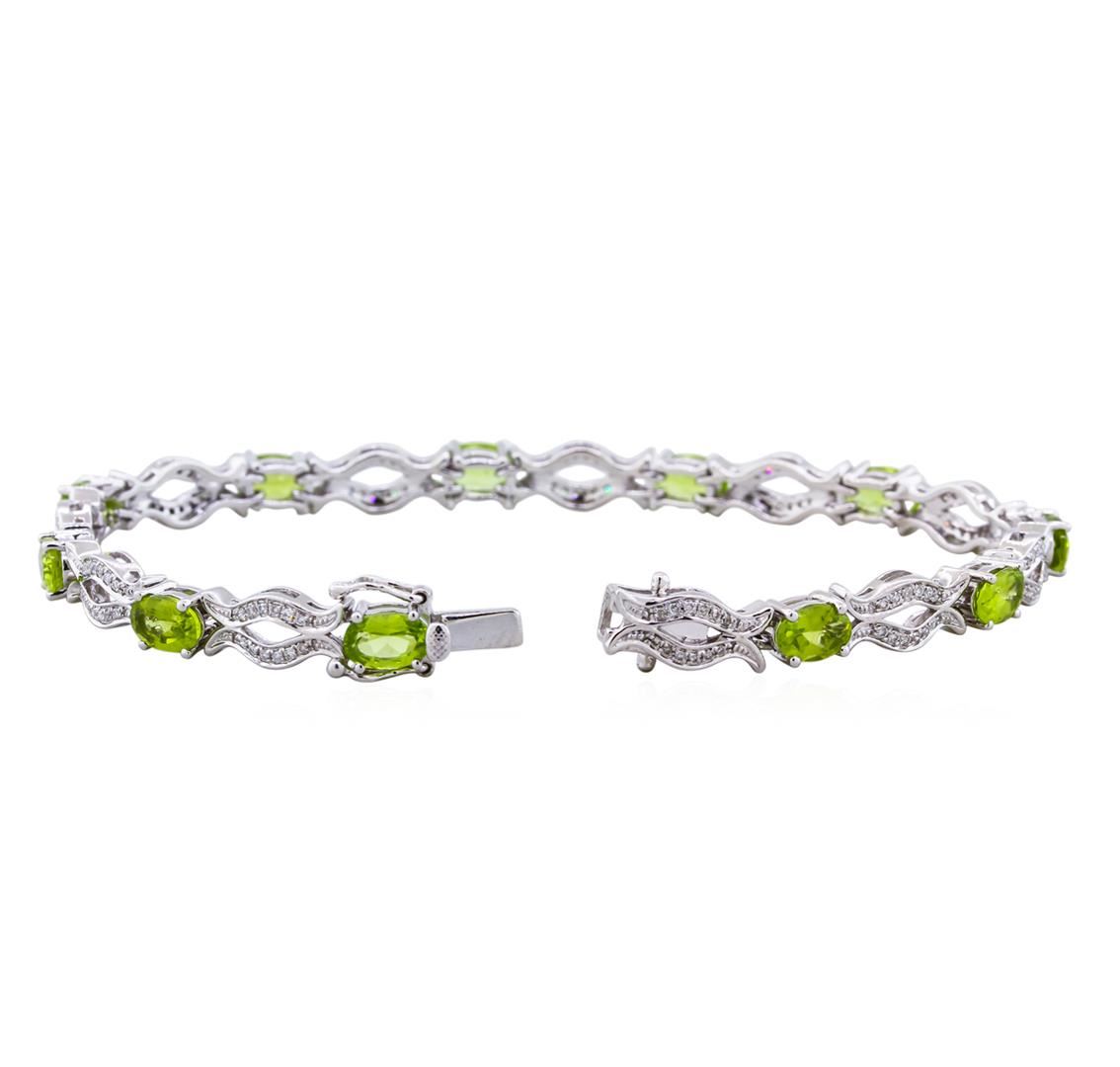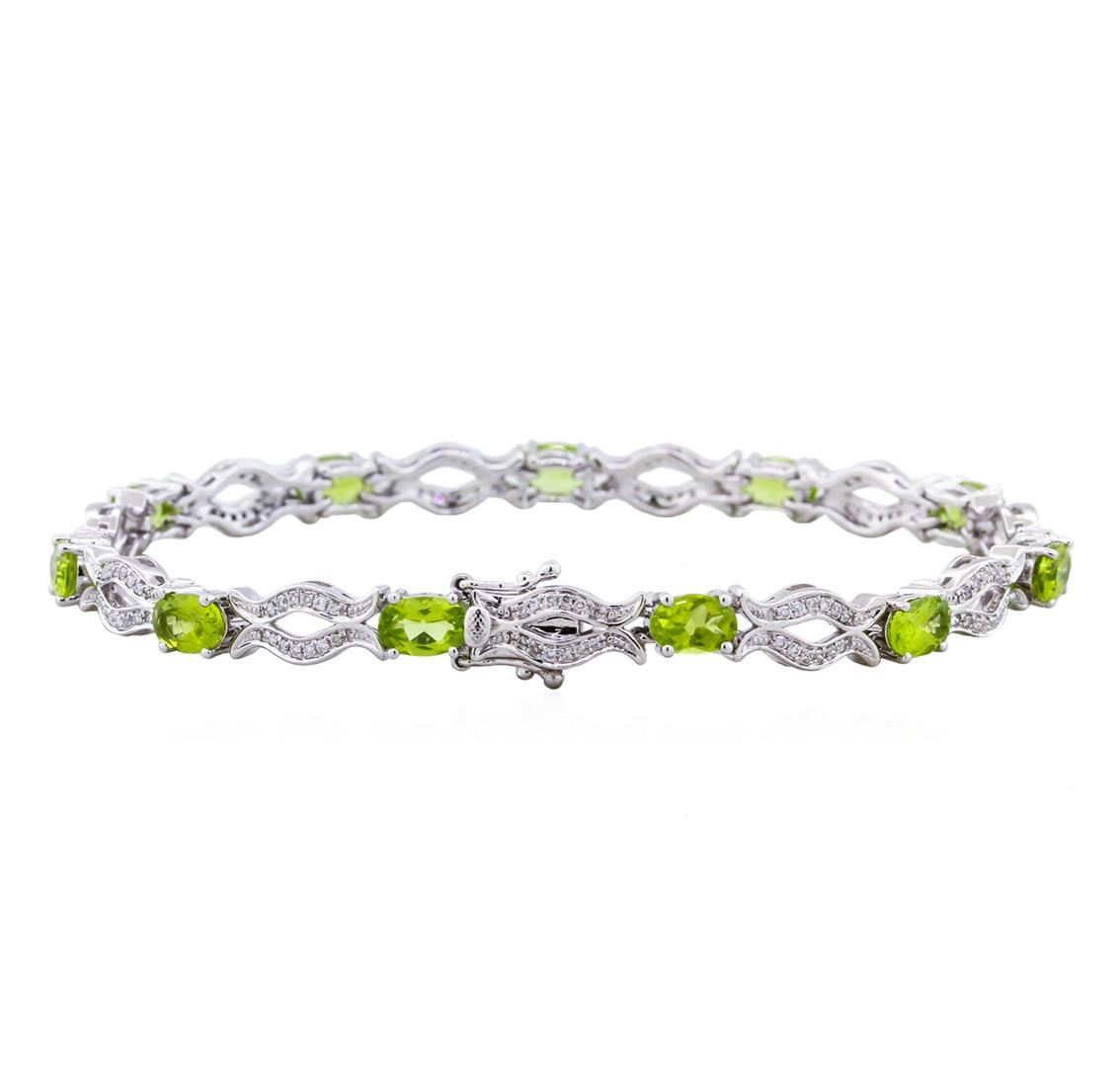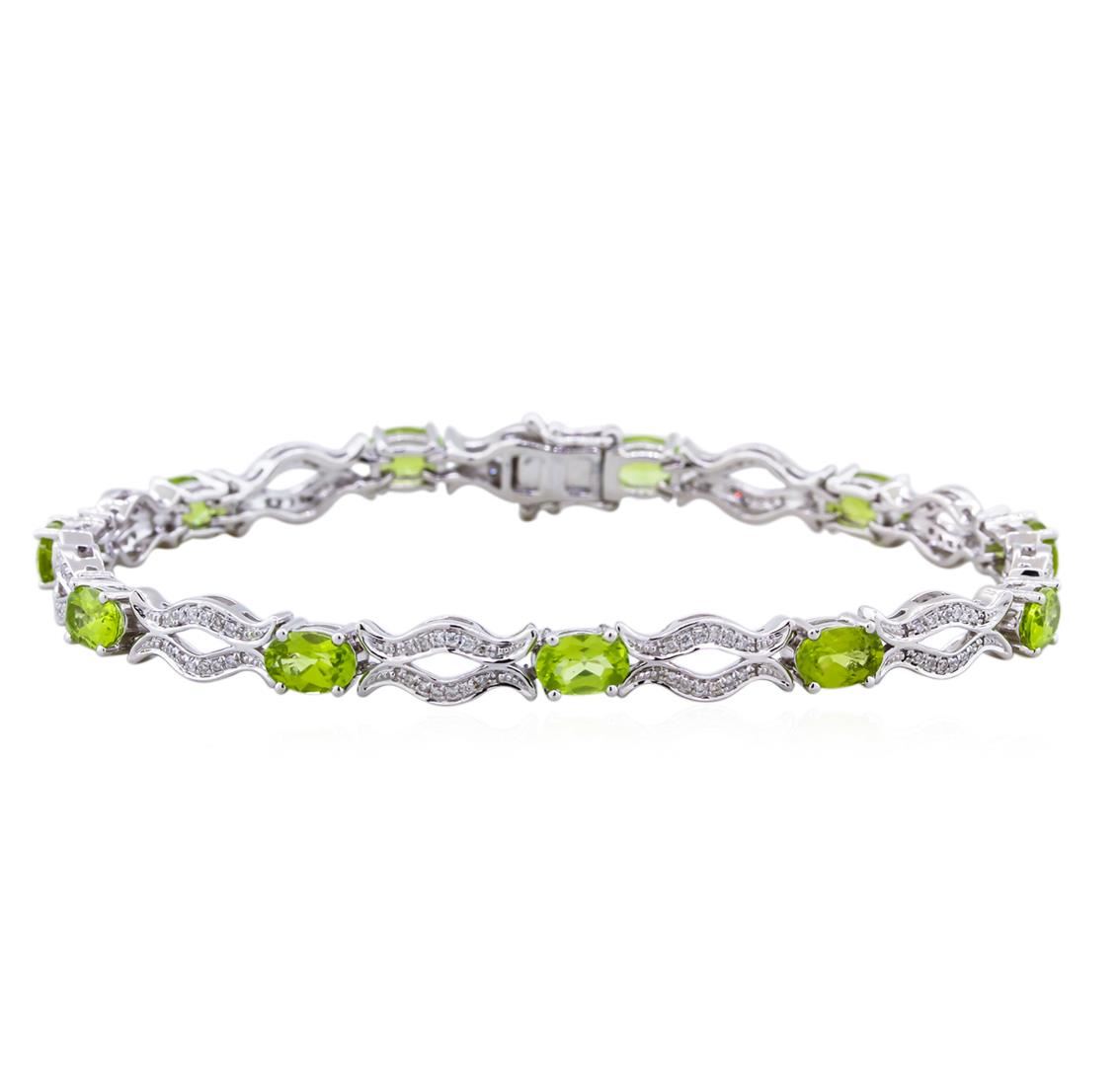 One peridot and diamond bracelet featuring: 14KT white gold weighing 12.55 grams containing one hundred and thirty-two round diamonds weighing 0.42 carats and eleven oval shaped peridot gemstones with a total weight of 5.48 carats. Open box closure with double safety lock clasps.