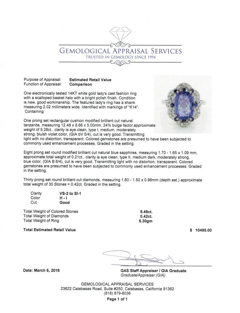 One electronically tested 14KT white gold lady's cast fashion ring with a scalloped basket halo with a bright polish finish. The featured lady's ring has a shank measuring 2.02 millimeters wide. Identified with markings of "K14". Condition is new, good workmanship. Containing: One prong set rectangular cushion modified brilliant cut natural tanzanite, measuring 12.48 x 8.66 x 5.00mm, 24%. bulge factor, approximate weight of 5.28ct., clarity is eye clean, type I, medium, moderately strong, bluish violet color, (GIA bV 5/4), cut is very good. Transmitting light with no distortion, transparent. Colored gemstones are presumed to have been subjected to commonly used enhancement processes. Graded in the setting. Eight prong set round modified brilliant cut natural blue sapphires, measuring 1.70 - 1.65 x 1.09 mm, approximate total weight of 0.21ct., clarity is eye clean, type II, medium dark, moderately strong, blue color, (GIA B 6/4), cut is very good. Transmitting light with no distortion, transparent. Graded in the setting. Thirty prong set round brilliant cut diamonds, measuring 1.60 - 1.50 x 0.96mm (depth est.) approximate total weight of 30 Stones = 0.42ct. Graded in the setting. Clarity: VS-2 to SI-1. Color: H - I, Cut Good. Total Weight of Colored Stones 5.49ct. Total Weight of Diamonds 0.42ct. Total Weight of Ring 6.30gm. GAS Appraised at $10,495.00.