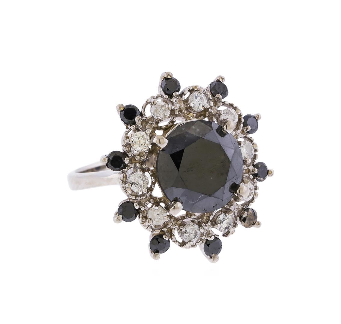 One electronically tested 14KT white gold ladies cast black and white diamond ring with a bright and milgrain finish. The black diamond is set within a black and white floral diamond bezel, completed by a two and one-half millimeter wide band. Identified with markings of "K14". Condition is new, good workmanship. Containing: One prong set round brilliant cut diamond, measuring 10.50 - 10.45 x 6.81mm (depth est.), 8.00.%. GTCF approximate weight of 4.47ct. Indications of multiple laboratory enhancements. Graded in the setting. Clarity D‚class‚. Color: Fancy Black; Irradiated. Ten prong set round brilliant cut diamonds, measuring 2.30 - 2.30 x 1.38mm (depth est.) approximate total weight of 10 Stones = 0.55ct. Indications of multiple laboratory enhancements. Graded in the setting. Clarity D‚class‚. Color: Fancy Black; Irradiated. Ten prong set round brilliant cut diamonds, measuring 2.30 - 2.20 x 1.35mm (depth est.) approximate total weight of 10 Stones = 0.49ct. Graded in the setting. Clarity: I-1 to I-3. Color: H - J. Total Weight of Diamonds 5.51ct. AIG Appraised at $7,270.00.