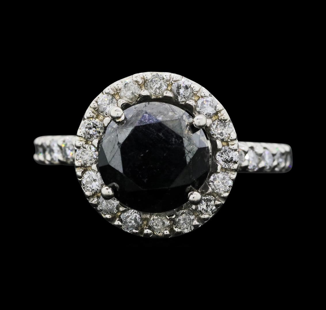 One electronically tested 14KT white gold ladies cast black and white diamond ring with a bright polish finish. The featured black diamond is set within a white diamond bezel supported by a white diamond accented under gallery and white diamond set shoulders, completed by a two millimeter wide band. Identified with markings of "K14". Condition is new, good workmanship. Containing: One prong set round brilliant cut diamond, measuring 9.05 - 9.00 x 7.10mm (depth est.), 20.00.%. GTCF approximate weight of 4.40ct. Indications of multiple laboratory enhancements. Graded in the setting. Clarity D‚class‚. Color: Fancy Black; Irradiated. Depth: 78.6%. Table: 63.1%. Forty prong set round brilliant cut diamonds, measuring 2.10 - 1.90 x 1.20mm (depth est.) approximate total weight of 40 Stones = 1.17ct. Faint brown secondary color throughout. Graded in the setting. Clarity: I-2 to I-3. Color: I - K. Total Weight of Diamonds 5.57ct. Total Weight of Ring 6.58gm. AIG Appraised.
