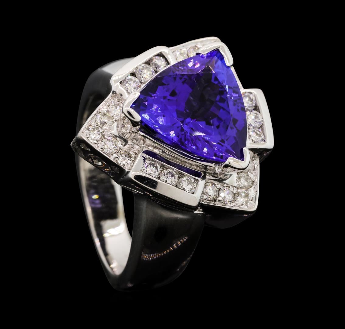 One electronically tested 14KT white gold lady's combination cast & assembled fashion ring with a cathedral shank with a basket halo with a bright polish finish. The featured lady's ring has a shank measuring 3.90 millimeters wide. Identified with markings of "14K". Condition is new, good workmanship. Containing: One prong set triangle modified brilliant cut natural tanzanite, measuring 12.90 x 12.10 x 6.00mm, (depth est.) approximate weight of 5.59ct., clarity is eye clean, medium dark, strong, violetish blue color, (GIA vB 6/5), cut is very good. Transmitting light with no distortion, transparent. Colored gemstones are presumed to have been subjected to commonly used enhancement processes. Graded in the setting. Nine channel set round brilliant cut diamonds, measuring 2.00 - 1.90 x 1.21mm (depth est.) approximate. Total Weight of 9 Stones = 0.25ct. Graded in the setting. Color H - I Clarity SI-1 to SI-2 Cut Good Fifteen prong set round brilliant cut diamonds, measuring 1.90 - 1.80 x 1.15mm (depth est.) approximate. Total Weight of 15 Stones = 0.36ct. Graded in the setting. Color H - I Clarity SI-1 to I-1 Cut Good. Total Weight of Colored Stones 5.59ct.. Total Weight of Diamonds 0.61ct.. Total Weight of Ring 16.20gm. GAS Appraised.