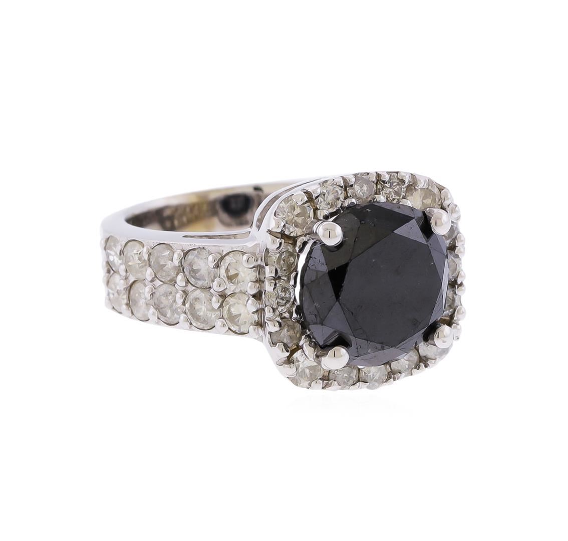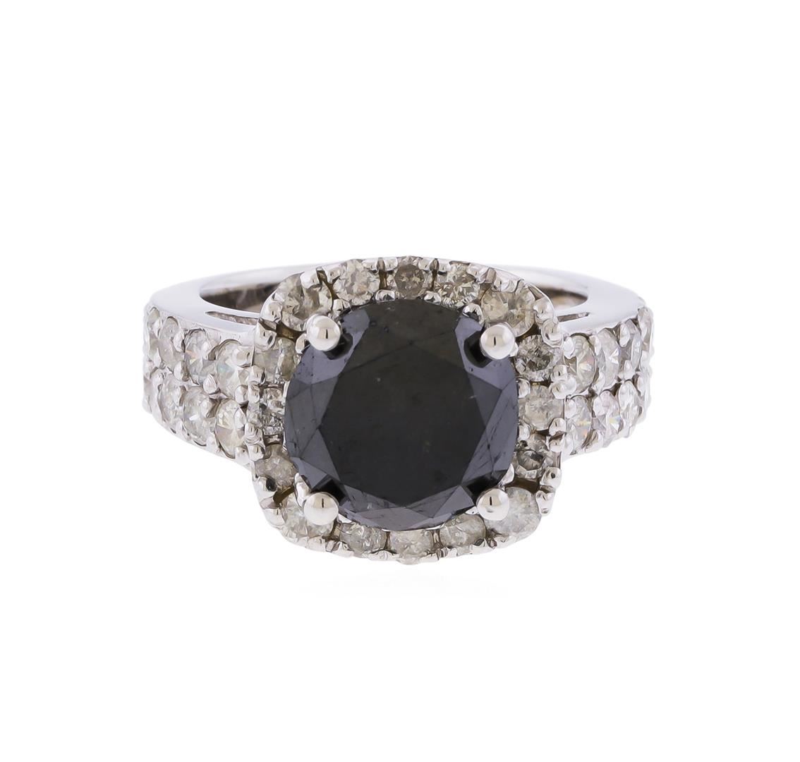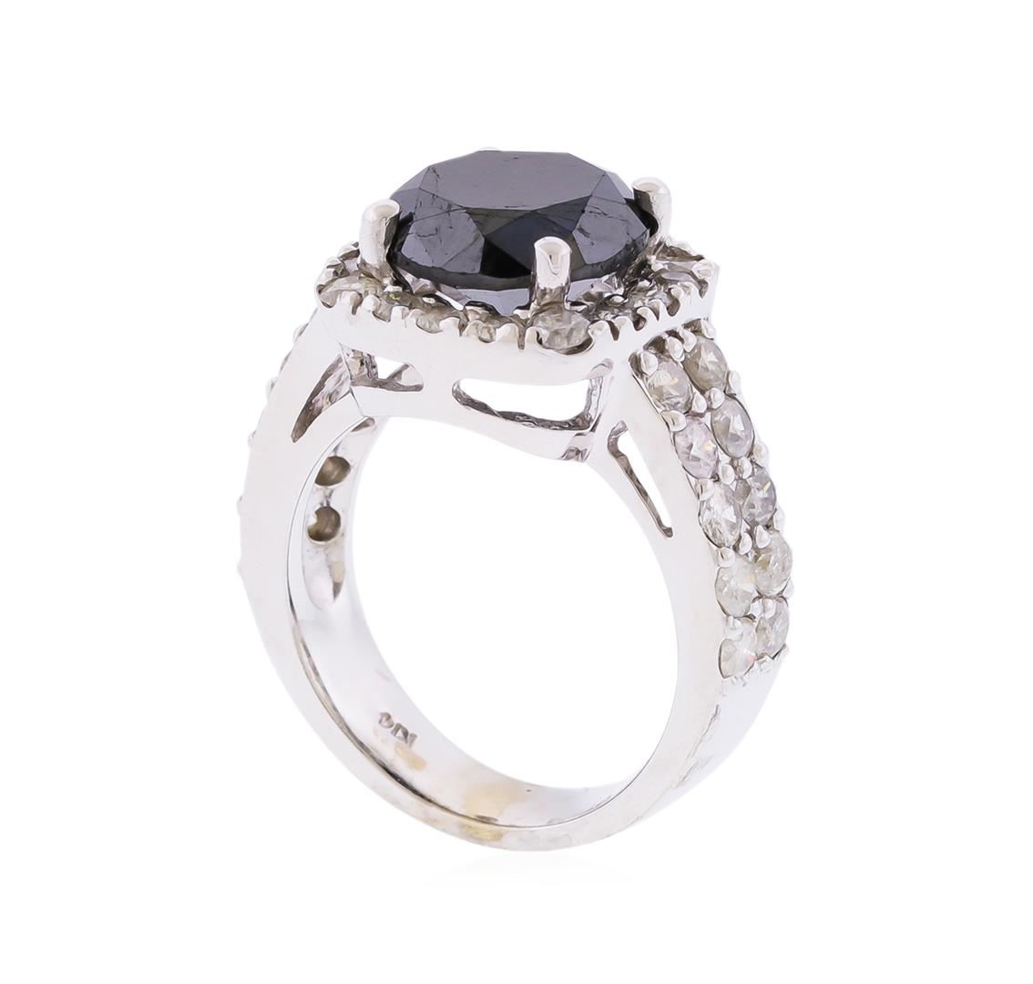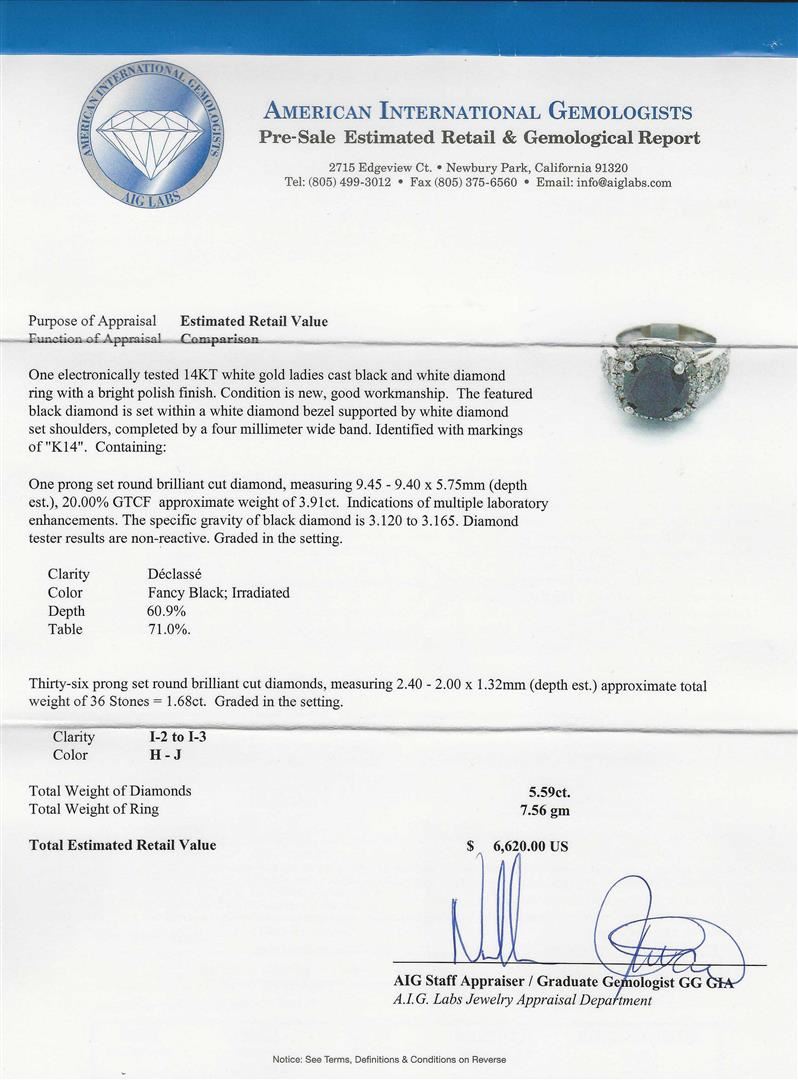 One electronically tested 14KT white gold ladies cast black and white diamond ring with a bright polish finish. The featured black diamond is set within a white diamond bezel supported by white diamond set shoulders, completed by a four millimeter wide band. Identified with markings of "K14". Condition is new, good workmanship. Containing: One prong set round brilliant cut diamond, measuring 9.45 - 9.40 x 5.75mm (depth est.), 20.00.%. GTCF approximate weight of 3.91ct. Indications of multiple laboratory enhancements. The specific gravity of black diamond is 3.120 to 3.165. Diamondtester results are non-reactive. Graded in the setting. Clarity D‚class‚. Color: Fancy Black; Irradiated. Depth: 60.9%. Table: 71.0%. Thirty-Six prong set round brilliant cut diamonds, measuring 2.40 - 2.00 x 1.32mm (depth est.) approximate total weight of 36 Stones = 1.68ct. Graded in the setting. Clarity: I-2 to I-3. Color: H - J. Total Weight of Diamonds 5.59ct. AIG Appraised at $6,620.00.