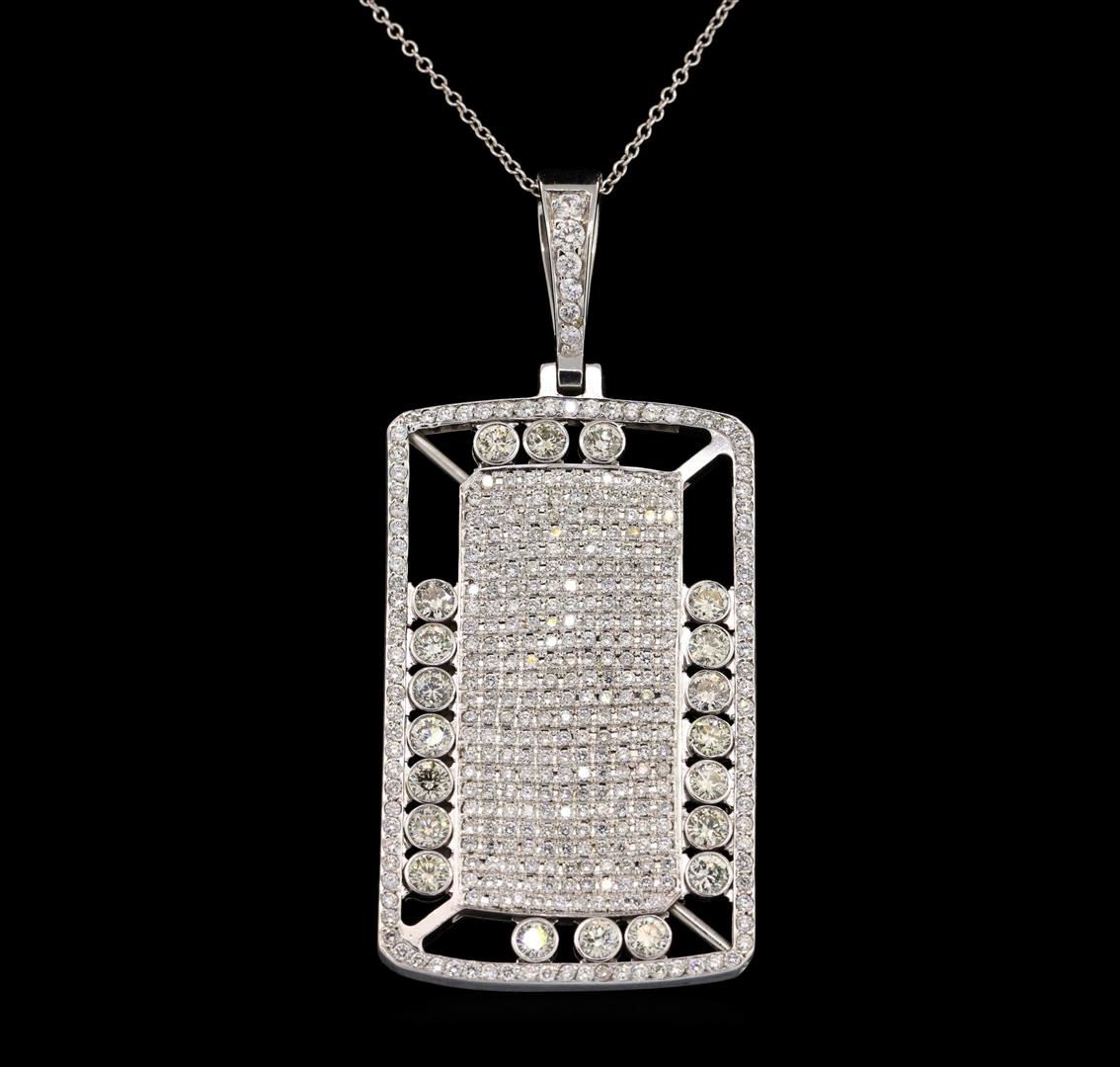 One electronically tested 14KT white gold lady's combination cast & assembled fashion pendant & chain 16.0" long, 1.3mm oval cable link with a lobster claw clasp with a bright polish finish. The featured lady's pendant has a dog tag motif and twenty bezel set sliding diamonds surrounding the center section of the pendant. Identified with markings of "585". Condition is new, good workmanship. Containing: Twenty bezel set round brilliant cut diamonds, measuring 3.30 - 3.10 x 1.92mm (depth est.) approximate total weight of 20 Stones = 2.37ct. Graded in the setting. Color H - JClarity SI-1 to SI-2 Cut Good Two prong set round brilliant cut diamonds, measuring 2.70 - 2.65 x 1.66mm (depth est.) approximate total weight of 2 Stones = 0.14ct. Graded in the setting. Color HClarity SI-1 Cut Good Four prong set round brilliant cut diamonds, measuring 2.20 - 1.70 x 1.21mm (depth est.) approximate total weight of 4 Stones = 0.11ct. Graded in the setting. Color H - I Clarity SI-1 to SI-3 Cut Good Three Hundred Fifty-Two prong set round brilliant cut diamonds, measuring 1.40 - 1.25 x 0.80mm (depth est.) approximate total weight of 352 Stones = 3.00ct. Graded in the setting. Color H - I Clarity SI-1 to I-1 Cut Good. Total Weight of Diamonds 5.62ct. Total Weight of Pendant & Chain 33.40gm. GAS Appraised.