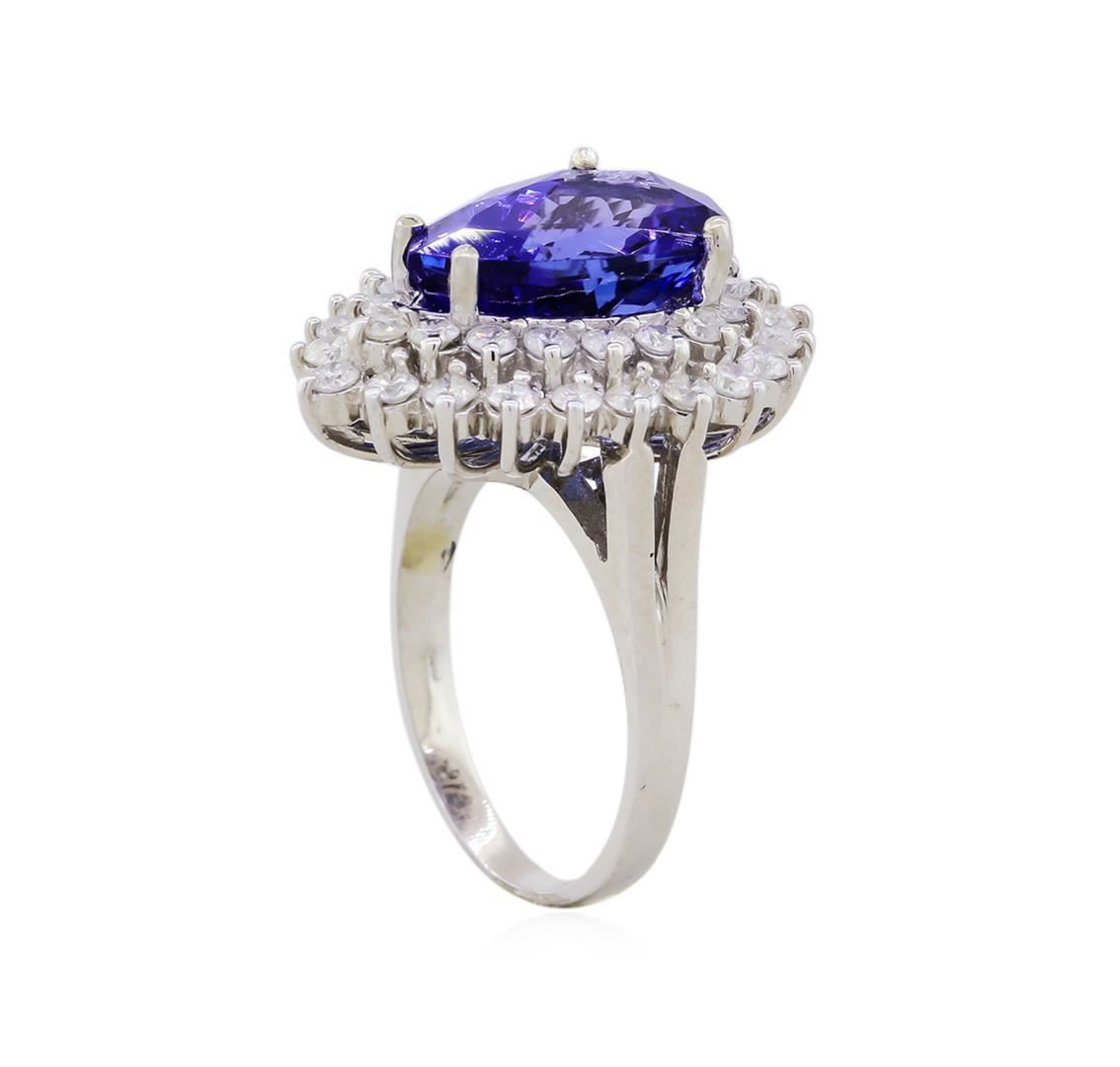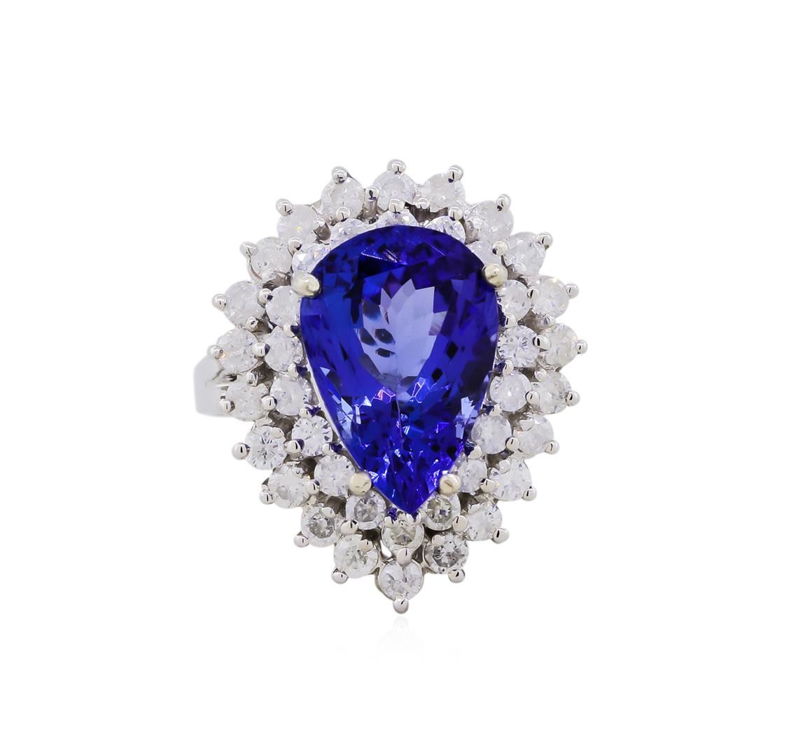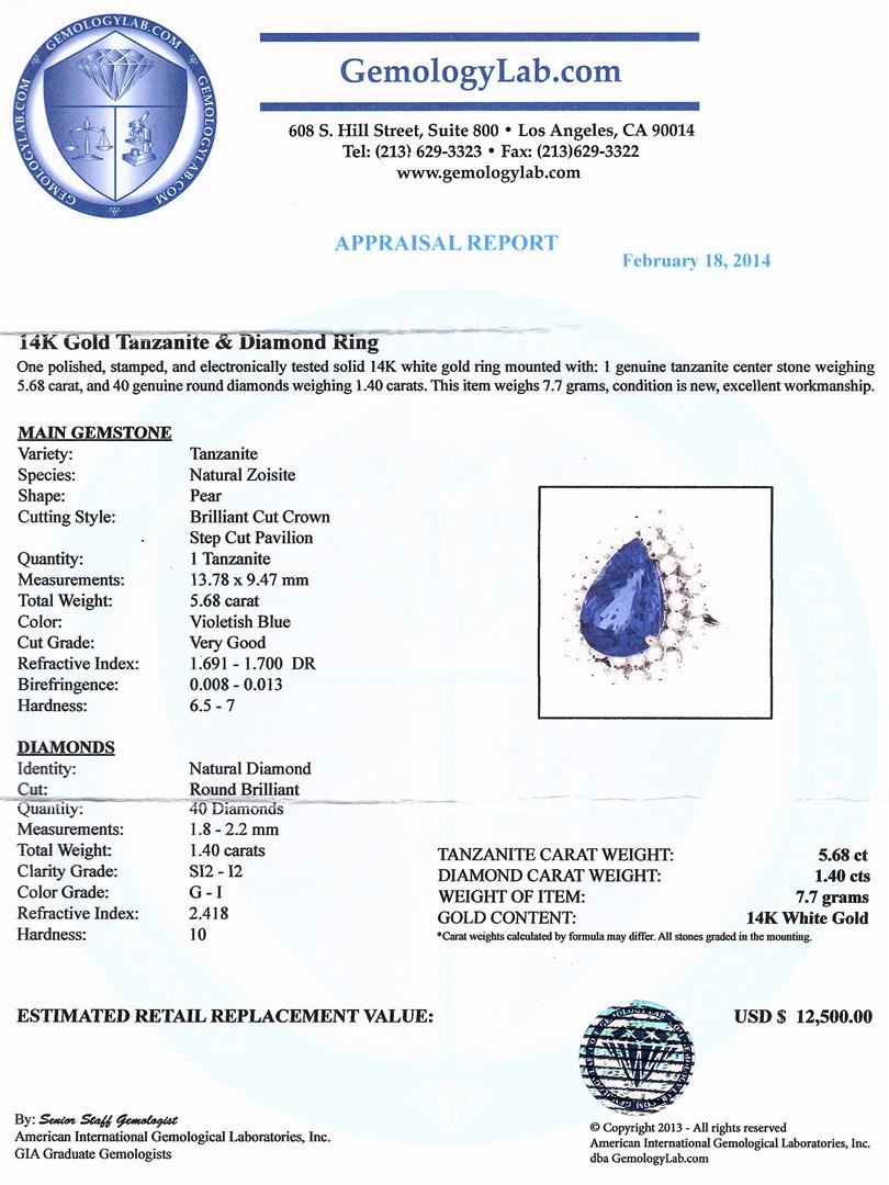 One polished, stamped and tested 14KT white gold ring mounted with: 1 genuine tanzanite center stone weighing 5.68 carats, and 40 genuine diamonds weighing 1.40 carats. The centerstone is pear shape with brilliant cut crown, step cut pavilion, meausring 13.78 x 9.47mm. Color is violetish blue. Clarity of 40 diamonds ranged from SI2-I2. This item weighs 7.7 grams, condition is new and workmanship is excellent. Gemology Lab Appraised at $12,500.00.