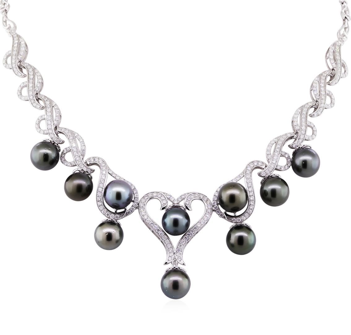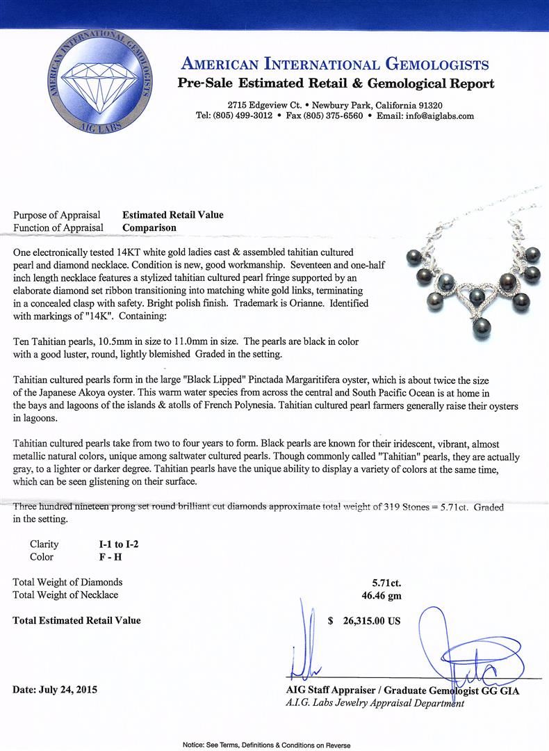 One electronically tested 14KT white gold ladies cast & assembled tahitian cultured pearl and diamond necklace. Seventeen and one-half inch length necklace features a stylized tahitian cultured pearl fringe supported by an elaborate diamond set ribbon transitioning into matching white gold links, terminating in a concealed clasp with safety. Bright polish finish. Trademark is Orianne. Identified with markings of "14K". Condition is new, good workmanship. Containing: Ten Tahitian pearls, 10.5mm in size to 11.0mm in size. The pearls are black in color with a good luster, round, lightly blemished Graded in the setting.Tahitian cultured pearls form in the large "Black Lipped" Pinctada Margaritifera oyster, which is about twice the size of the Japanese Akoya oyster. This warm water species from across the central and South Pacific Ocean is at home in the bays and lagoons of the islands & atolls of French Polynesia. Tahitian cultured pearl farmers generally raise their oysters in lagoons.Tahitian cultured pearls take from two to four years to form. Black pearls are known for their iridescent, vibrant, almost metallic natural colors, unique among saltwater cultured pearls. Though commonly called "Tahitian" pearls, they are actually gray, to a lighter or darker degree. Tahitian pearls have the unique ability to display a variety of colors at the same time, which can be seen glistening on their surface. Three Hundred Nineteen prong set round brilliant cut diamonds approximate. Total Weight of 319 Stones = 5.71ct. Graded in the setting. Clarity: I-1 to I-2. Color: F - H. Total Weight of Diamonds 5.71ct. Total Weight of Necklace 46.46gm. AIG Appraised at $26,315.00.