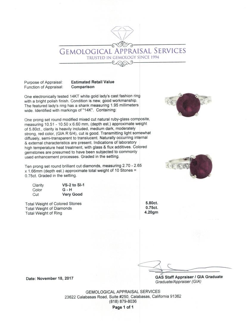 One electronically tested 14KT white gold lady's cast fashion ring with a bright polish finish. The featured lady's ring has a shank measuring 1.95 millimeters wide. Identified with markings of '14K'. Condition is new, good workmanship. Containing: One prong set round modified mixed cut natural ruby-glass composite, measuring 10.51 - 10.50 x 6.60 mm, (depth est.) approximate weight of 5.80ct., clarity is heavily included, medium dark, moderately strong, red color, (GIA R 6/4), cut is good. Transmitting light somewhat diffusely, semi-transparent to translucent. Naturally occurring internal & external characteristics are present. Indications of laboratory high temperature heat treatment, with glass & flux additives. Colored gemstones are presumed to have been subjected to commonly used enhancement processes. Graded in the setting. Ten prong set round brilliant cut diamonds, measuring 2.70 - 2.65 x 1.66mm (depth est.) approximate total weight of 10 Stones = 0.75ct. Graded in the setting. Color G - H Clarity VS-2 to SI-1 Cut Very Good. Total Weight of Colored Stones 5.80ct.. Total Weight of Diamonds 0.75ct.. Total Weight of Ring 4.20gm. GAS Appraised.