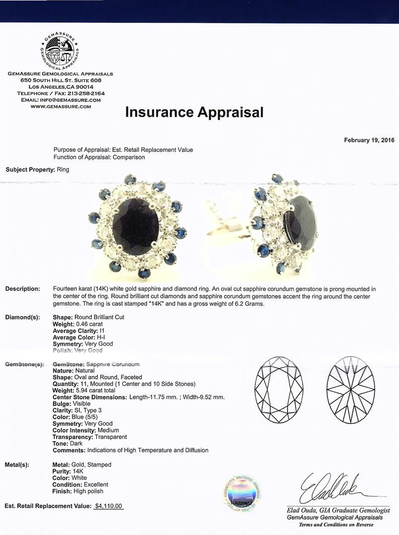 Fourteen Karat (14K) White Gold Sapphire Diamond Ring. An Oval Cut Sapphire Corundum Gemstone Is Prong Mounted In The Center Of The Ring. Round Brilliant Cut Diamonds And Sapphire Corundum Gemstones Accent The Ring Around The Center. The Ring Is Cast Stamped "14K' And Has A Gross Weight Of 6.2 Grams. Diamonds: Shape: Round Brilliant Cut, Weight: 0.46 Carat, Average Clarity: Il, Average Color: I1, Symmetry: Very Good, Gemstones: Sapphire Corundum, Nature: Natural, Shape: Oval And Round, Faceted. Quantity: 11, Mounted (1 Center And 10 Side Stones), Weight: 5.94 Carat Total, Center Stone Dimensions: Length-11.75Mm, Width-9.52Mm. Bulge: Visible, Clarity: Si, Type 3, Color: Blue (5/5), Symmetry: Very Good, Color Intensity: Medium, Transparency: Transparent, Tone: Dark, Comments: Indications Of High Temperature And Diffusion. Metal: Gold. Stamped, Purity: 14K, Color: White, Condition: Excellent, Finish: High Polish. GGA Appraised at $4,110.00.