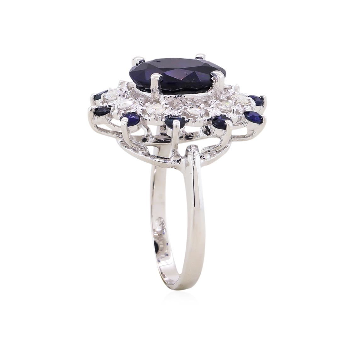 Fourteen Karat (14K) White Gold Sapphire Diamond Ring. An Oval Cut Sapphire Corundum Gemstone Is Prong Mounted In The Center Of The Ring. Round Brilliant Cut Diamonds And Sapphire Corundum Gemstones Accent The Ring Around The Center. The Ring Is Cast Stamped "14K' And Has A Gross Weight Of 6.2 Grams. Diamonds: Shape: Round Brilliant Cut, Weight: 0.46 Carat, Average Clarity: Il, Average Color: I1, Symmetry: Very Good, Gemstones: Sapphire Corundum, Nature: Natural, Shape: Oval And Round, Faceted. Quantity: 11, Mounted (1 Center And 10 Side Stones), Weight: 5.94 Carat Total, Center Stone Dimensions: Length-11.75Mm, Width-9.52Mm. Bulge: Visible, Clarity: Si, Type 3, Color: Blue (5/5), Symmetry: Very Good, Color Intensity: Medium, Transparency: Transparent, Tone: Dark, Comments: Indications Of High Temperature And Diffusion. Metal: Gold. Stamped, Purity: 14K, Color: White, Condition: Excellent, Finish: High Polish. GGA Appraised at $4,110.00.