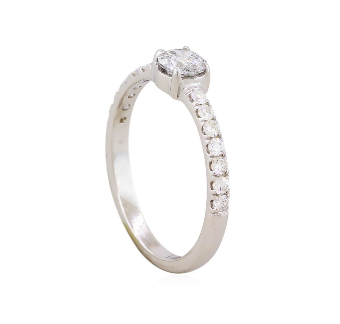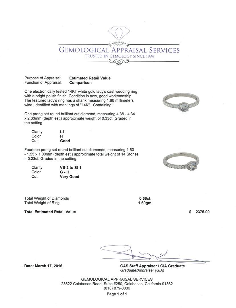 One electronically tested 14KT white gold lady's cast wedding ring with a bright polish finish. Condition is new, good workmanship. The featured lady's ring has a shank measuring 1.86 millimeters wide. Identified with markings of "14K". Containing: One prong set round brilliant cut diamond, measuring 4.38 - 4.34 x 2_63mm (depth est.) approximate weight of 0.33ct. Graded in the setting. Clarity: I1, Color: H, Cut: Good. Fourteen prong set round brilliant cut diamonds, measuring 1.60-1.55 x 1.00mm (depth est.) approximate total weight Of 14 Stones = 0.23ct. Graded in the setting. Clarity: VS-2 to SI-1, Color: G-H, Cut: Very Good. Total Weight of Diamonds 0.56ctw. Total weight of Rin 1.60 grams. GAS Appraised at $2,375.00.