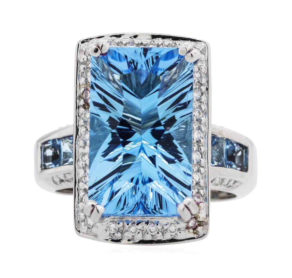 One lady's ring featuring: 14KT white gold weighing 12.3 grams containing a blue topaz weighing 6.00ct diamonds weighing 0.50ctw. The ring is a size 8.