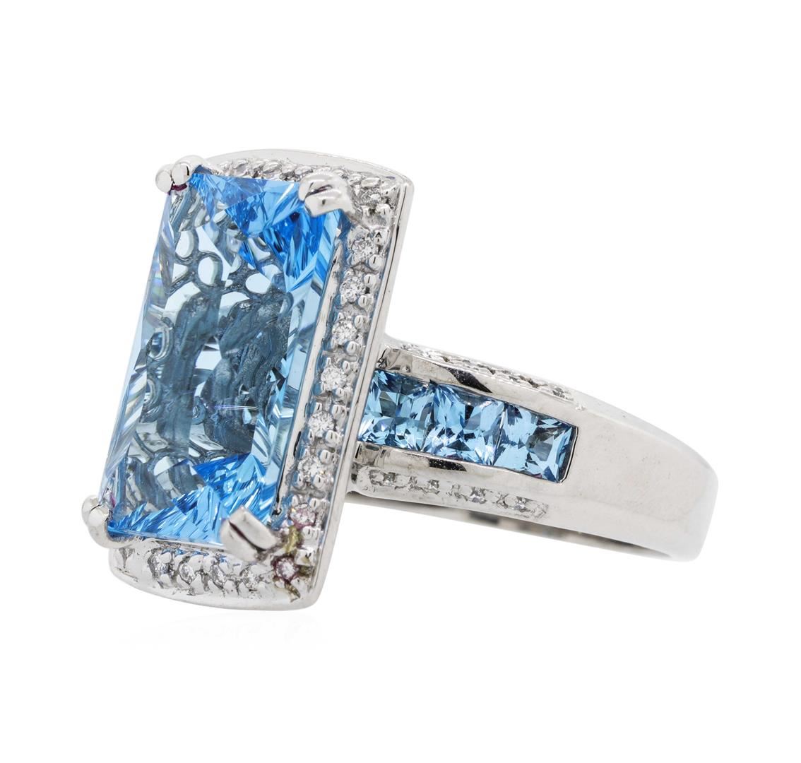 One lady's ring featuring: 14KT white gold weighing 12.3 grams containing a blue topaz weighing 6.00ct diamonds weighing 0.50ctw. The ring is a size 8.
