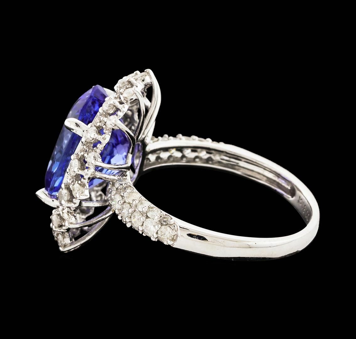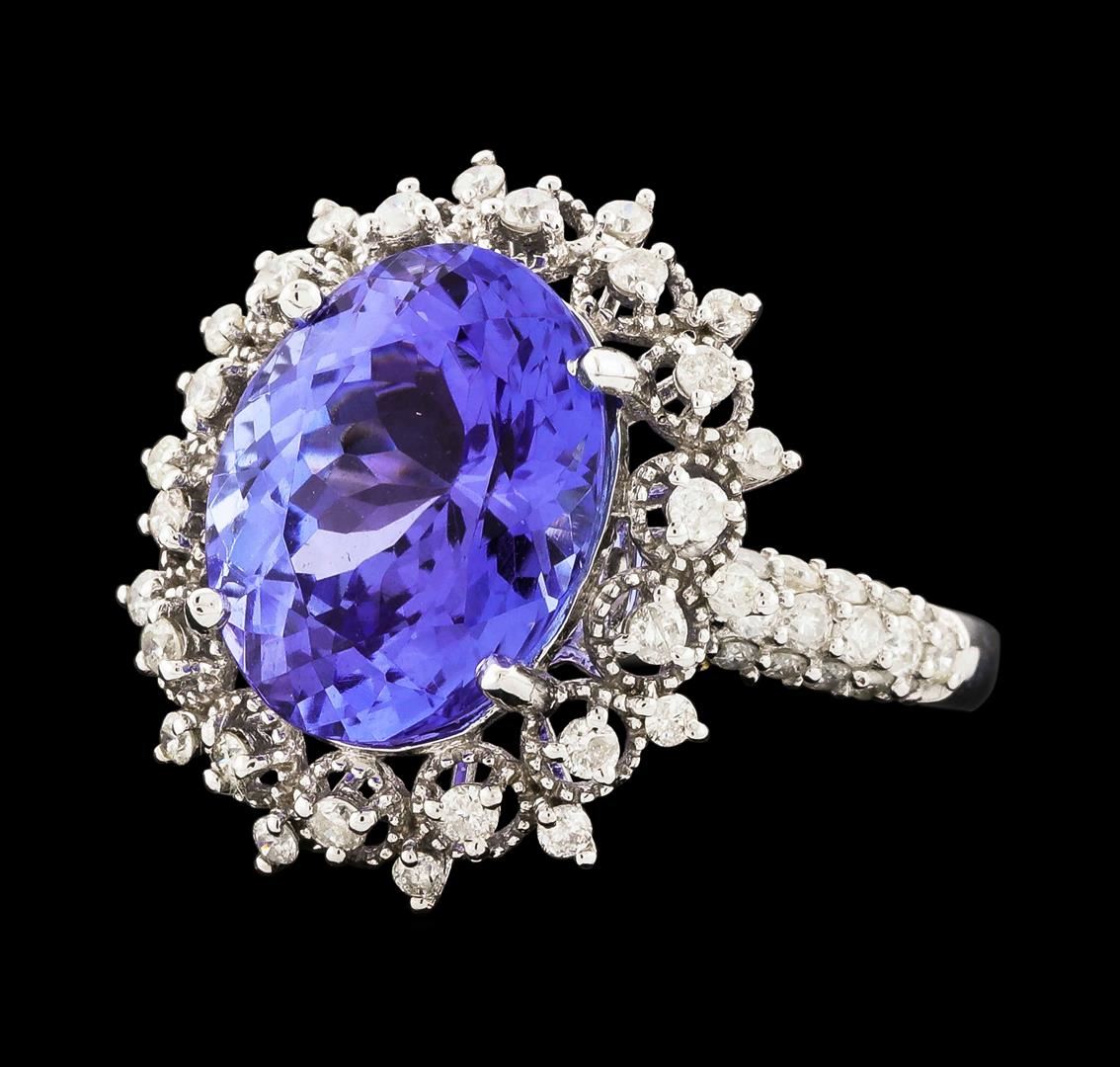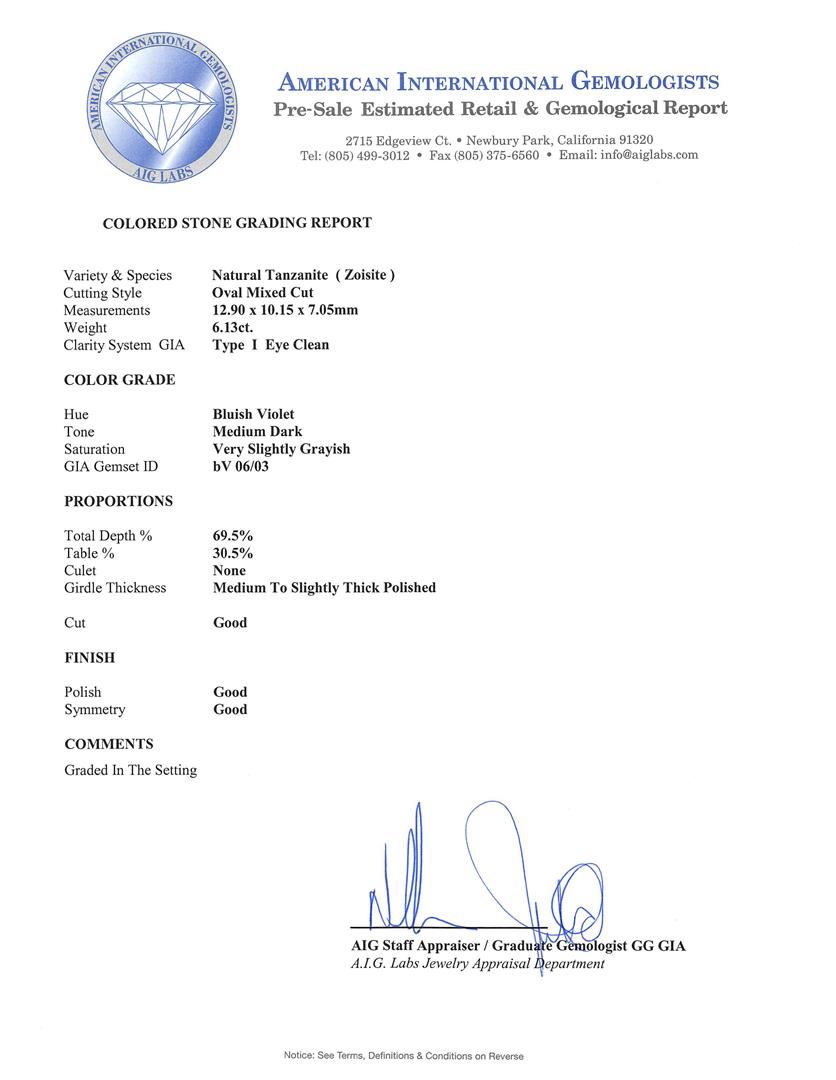 One electronically tested 14KT white gold ladies cast tanzanite and diamond ring. The featured tanzanite is set within a stylized diamond floret bezel supported by diamond set shoulders, completed by a two millimeter wide band. Bright polish finish with milgrain detailing. Trademark is Orianne. Identified with markings of "14K". Condition is new, good workmanship. Containing: One prong set oval mixed cut natural tanzanite, measuring 12.90 x 10.15 x 7.05mm, approximate weight of 6.13ct., clarity is eye clean, type I, medium dark, very slightly grayish, bluish violet color, (GIA bV 6/3), cut is good. Transmitting light with no distortion, transparent. Colored Stone Grading Report attached. Graded in the setting. Tanzanite is a very rare gemstone that is only found in the country of Tanzania. Originally discovered in 1967. Tiffany & Company, named the stone Tanzanite. It is found in the Usumburu Mountains that border the Umba Valley of northern Tanzania. Tanzanite occurs in gray, brown, violet, blue, reddish-purple, & green. The gem is interesting because of its exceptional pleochroism. Rotated in different directions a tanzanite will exhibit multiple changes of color. Tanzanite has a low tolerance to ultrasonic cleaning, and should not be cleaned using this method. Sixty-Four prong set round brilliant cut diamonds approximate total weight of 64 Stones = 0.81ct. Graded in the setting. Clarity: I-1 to I-2. Color: H - J. Total Weight of Colored Stones 6.13ct. Total Weight of Diamonds 0.81ct. Total Weight of Ring 4.43gm. AIG Appraised at $17,060.00.