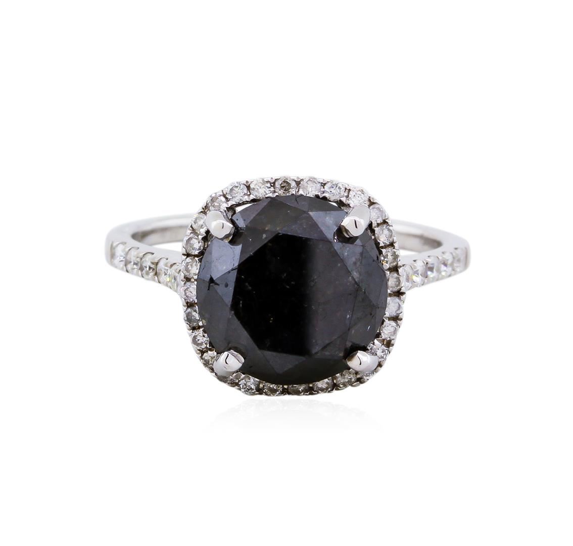 14KT white gold fancy black and white diamond ring. A fancy black round brilliant cut diamonds totalling 5.94 carats is prong mounted in the center of the ring. Round brilliant cut diamonds with an average clarity of I1 weigh in at an approximate 0.36 carats and accent the center diamond and on both sides. The ring is cast stamped "14K" and has a gross weight of 4.2 grams. Condition: Excellent GGA Appraised at $8,995.00.