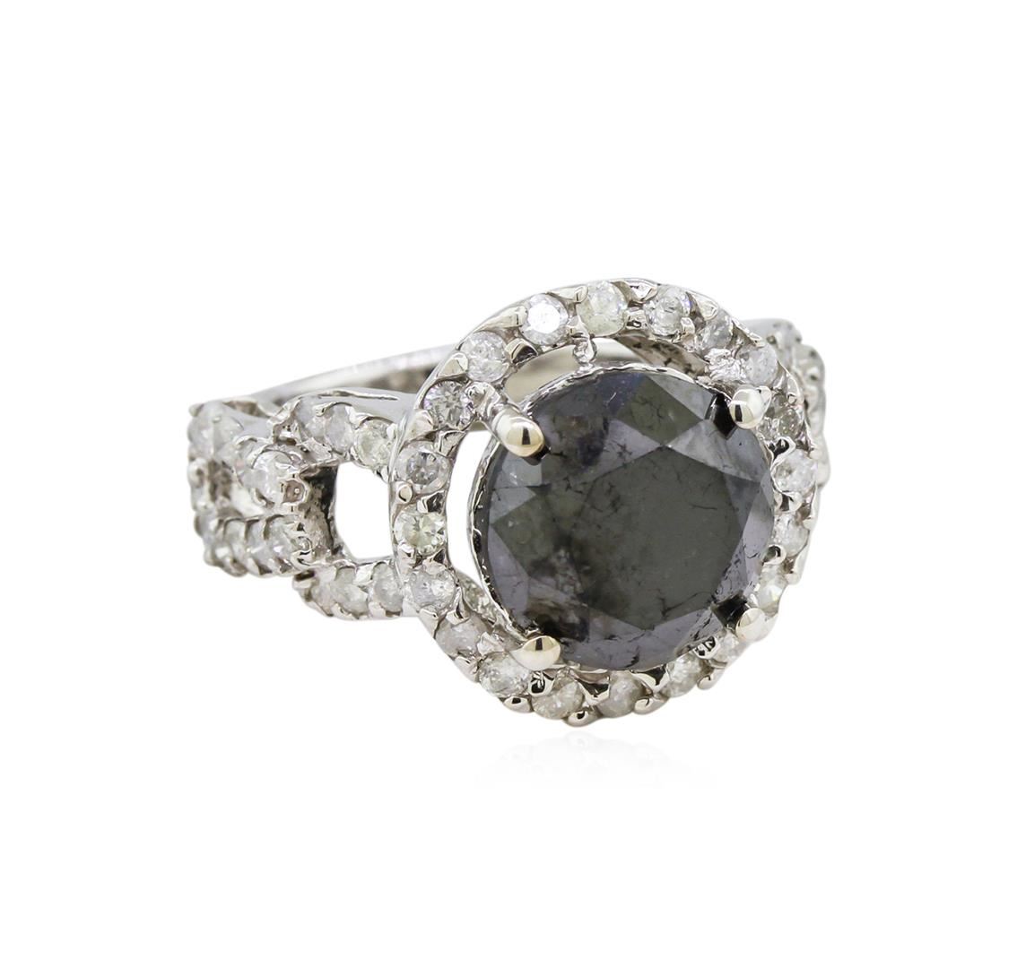 One electronically tested 14KT white gold ladies cast black and white diamond ring with a bright polish finish. The featured black diamond is set within a white diamond bezel, and supported by stylized white diamond set shoulders. The ring is completed by a two and one-half millimeter wide band. Identified with markings of "K14". Condition is new, good workmanship. Containing: One prong set round brilliant cut diamond, measuring 10.25 - 10.20 x 7.50mm (depth est.), 5.00.%. GTCF approximate weight of 5.06ct. Indications of multiple laboratory enhancements. Graded in the setting. Clarity D‚class‚. Color: Fancy Black; Irradiated. Depth: 73.3%. Table: 68.4%. Forty-Eight prong set round brilliant cut diamonds, measuring 2.00 - 1.80 x 1.14mm (depth est.) approximate. Total Weight of 48 Stones = 1.28ct. Graded in the setting. Clarity: I-1 to I-2. Color: G - I. Total Weight of Diamonds 6.34ct. AIG Appraised at $10,110.00.