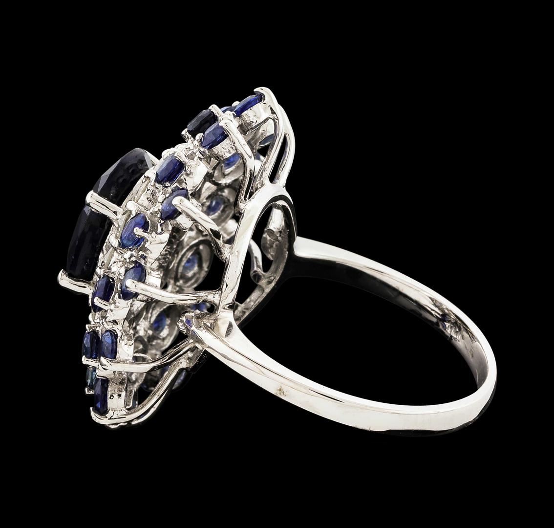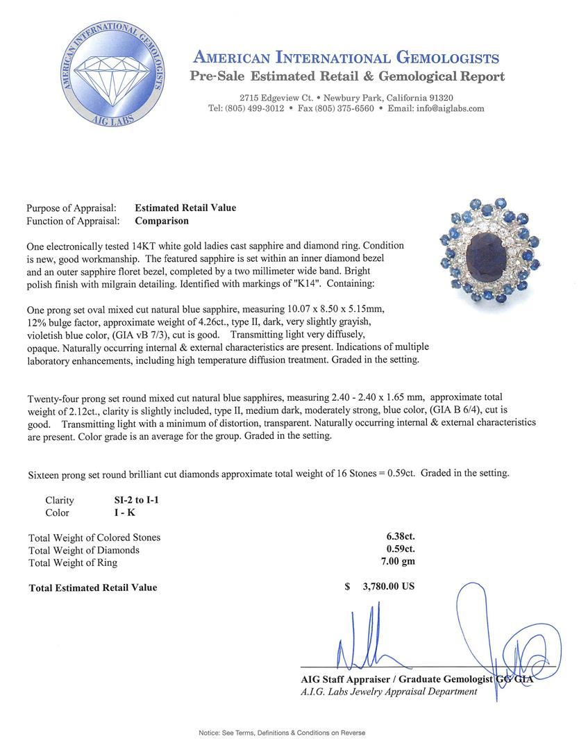 one and one-half millimeter wide band. Identified with markings of "K14". Condition is new, good workmanship. Containing: One prong set oval mixed cut natural tanzanite, measuring 11.30 x 9.40 x 5.85mm, 20%. bulge factor, approximate weight of 5.13ct., clarity is eye clean, type I, dark, very slightly grayish, violetish blue color, (GIA vB 7/3), cut is good. Natural Tanzanite, color enhanced due to cobalt coating. The presence of the coating prevents determining the stone's actual depth of color. Transmitting light with no distortion, transparent. Grading in the setting. The cobalt coated Tanzanite has a low tolerance to ultrasonic cleaning, and should not be cleaned using this method. Tanzanite is a very rare gemstone that is only found in the country of Tanzania. Originally discovered in 1967. Tiffany & Company, named the stone Tanzanite. It is found in the Usumburu Mountains that border the Umba Valley of northern Tanzania. Tanzanite occurs in gray, brown, violet, blue, reddish-purple, & green. The gem is interesting because of its exceptional pleochroism. Rotated in different directions a tanzanite will exhibit multiple changes of color. Thirty prong set round brilliant cut diamonds, measuring 1.60 - 1.50 x 0.93mm (depth est.) approximate total weight of 30 Stones = 0.50ct. Graded in the setting. Clarity: I-1 to I-2. Color: I - K. Total Weight of Colored Stones 5.13ct. Total Weight of Diamonds 0.50ct. Total Weight of Ring 4.03gm. AIG Appraised at $3,780.00.