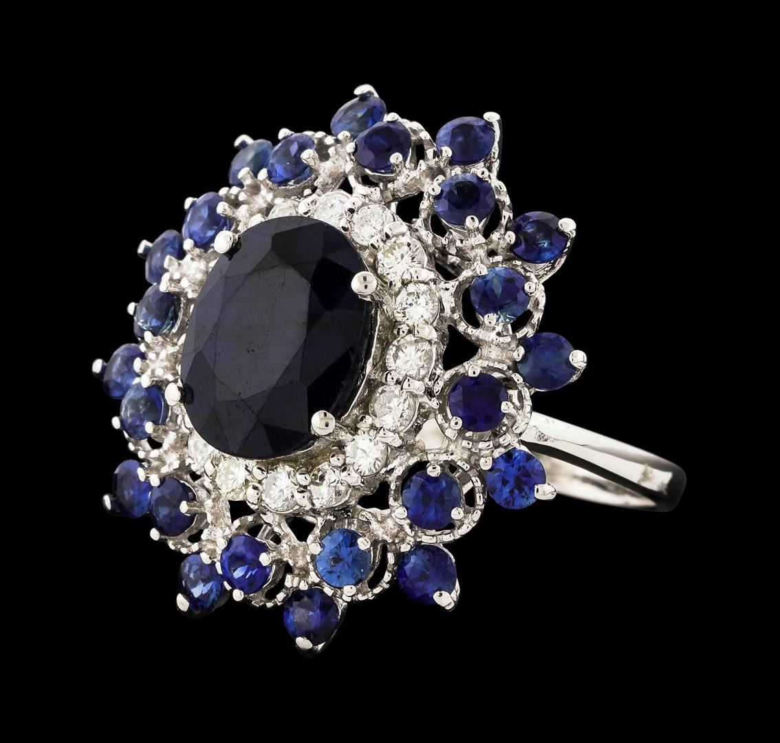 One electronically tested 14KT white gold ladies cast sapphire and diamond ring. The featured sapphire is set within an inner diamond bezel and an outer sapphire floret bezel, completed by a two millimeter wide band. Bright polish finish with milgrain detailing. Identified with markings of "K14". Condition is new, good workmanship. Containing: One prong set oval mixed cut natural blue sapphire, measuring 10.07 x 8.50 x 5.15mm, 12%. bulge factor, approximate weight of 4.26ct., type II, dark, very slightly grayish, violetish blue color, (GIA vB 7/3), cut is good. Transmitting light very diffusely, opaque. Naturally occurring internal & external characteristics are present. Indications of multiple laboratory enhancements, including high temperature diffusion treatment. Graded in the setting. Twenty-four prong set round mixed cut natural blue sapphires, measuring 2.40 - 2.40 x 1.65 mm, approximate total weight of 2.12ct., clarity is slightly included, type II, medium dark, moderately strong, blue color, (GIA B 6/4), cut is good. Transmitting light with a minimum of distortion, transparent. Naturally occurring internal & external characteristics are present. Color grade is an average for the group. Graded in the setting. Sixteen prong set round brilliant cut diamonds approximate total weight of 16 Stones = 0.59ct. Graded in the setting. Clarity: SI-2 to I-1. Color: I - K. Total Weight of Colored Stones 6.38ct. Total Weight of Diamonds 0.59ct. Total Weight of Ring 7.00gm. AIG Appraised.