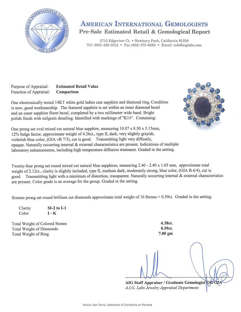 One electronically tested 14KT white gold ladies cast sapphire and diamond ring. The featured sapphire is set within an inner diamond bezel and an outer sapphire floret bezel, completed by a two millimeter wide band. Bright polish finish with milgrain detailing. Identified with markings of "K14". Condition is new, good workmanship. Containing: One prong set oval mixed cut natural blue sapphire, measuring 10.07 x 8.50 x 5.15mm, 12%. bulge factor, approximate weight of 4.26ct., type II, dark, very slightly grayish, violetish blue color, (GIA vB 7/3), cut is good. Transmitting light very diffusely, opaque. Naturally occurring internal & external characteristics are present. Indications of multiple laboratory enhancements, including high temperature diffusion treatment. Graded in the setting. Twenty-four prong set round mixed cut natural blue sapphires, measuring 2.40 - 2.40 x 1.65 mm, approximate total weight of 2.12ct., clarity is slightly included, type II, medium dark, moderately strong, blue color, (GIA B 6/4), cut is good. Transmitting light with a minimum of distortion, transparent. Naturally occurring internal & external characteristics are present. Color grade is an average for the group. Graded in the setting. Sixteen prong set round brilliant cut diamonds approximate total weight of 16 Stones = 0.59ct. Graded in the setting. Clarity: SI-2 to I-1. Color: I - K. Total Weight of Colored Stones 6.38ct. Total Weight of Diamonds 0.59ct. Total Weight of Ring 7.00gm. AIG Appraised.