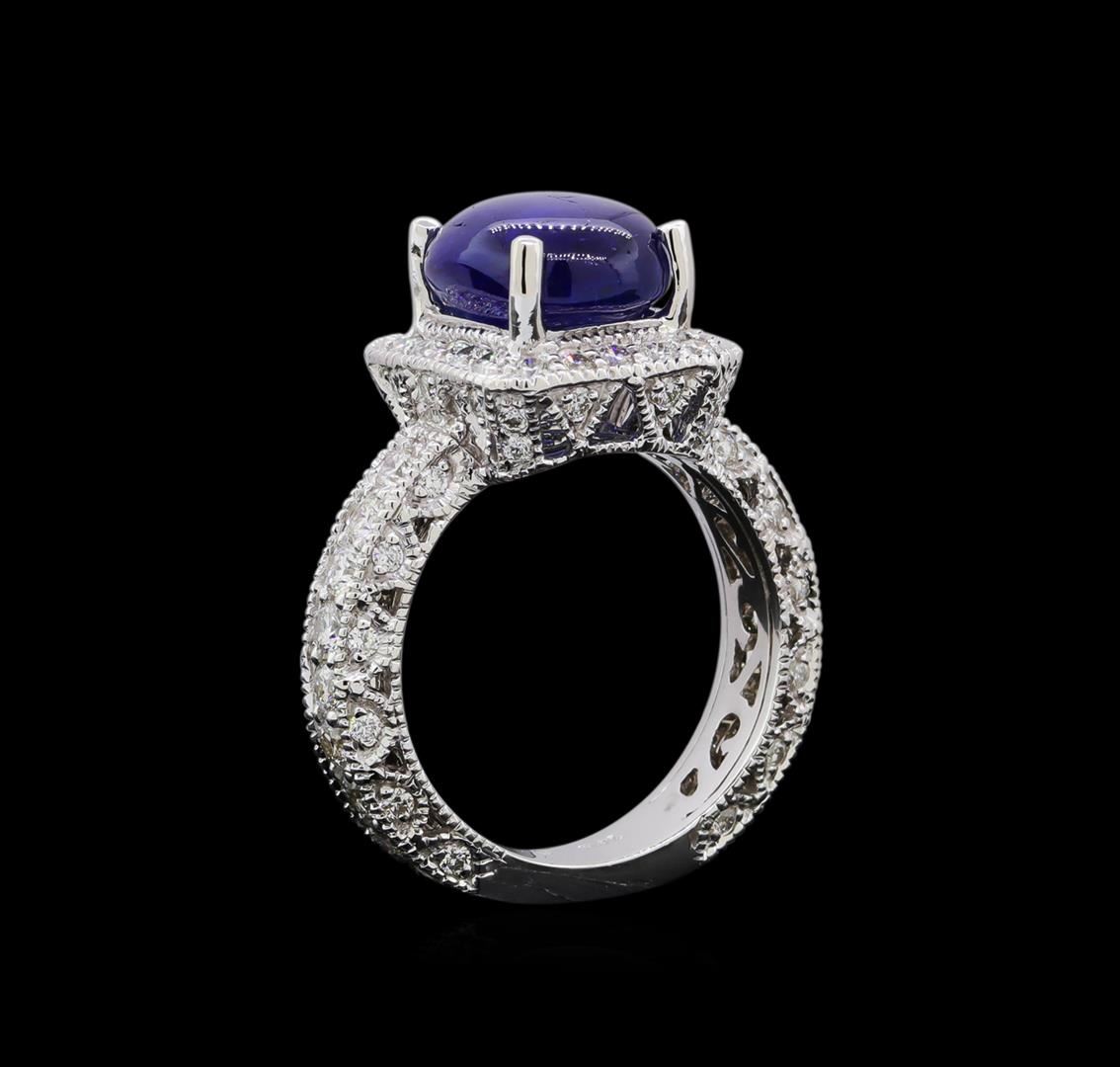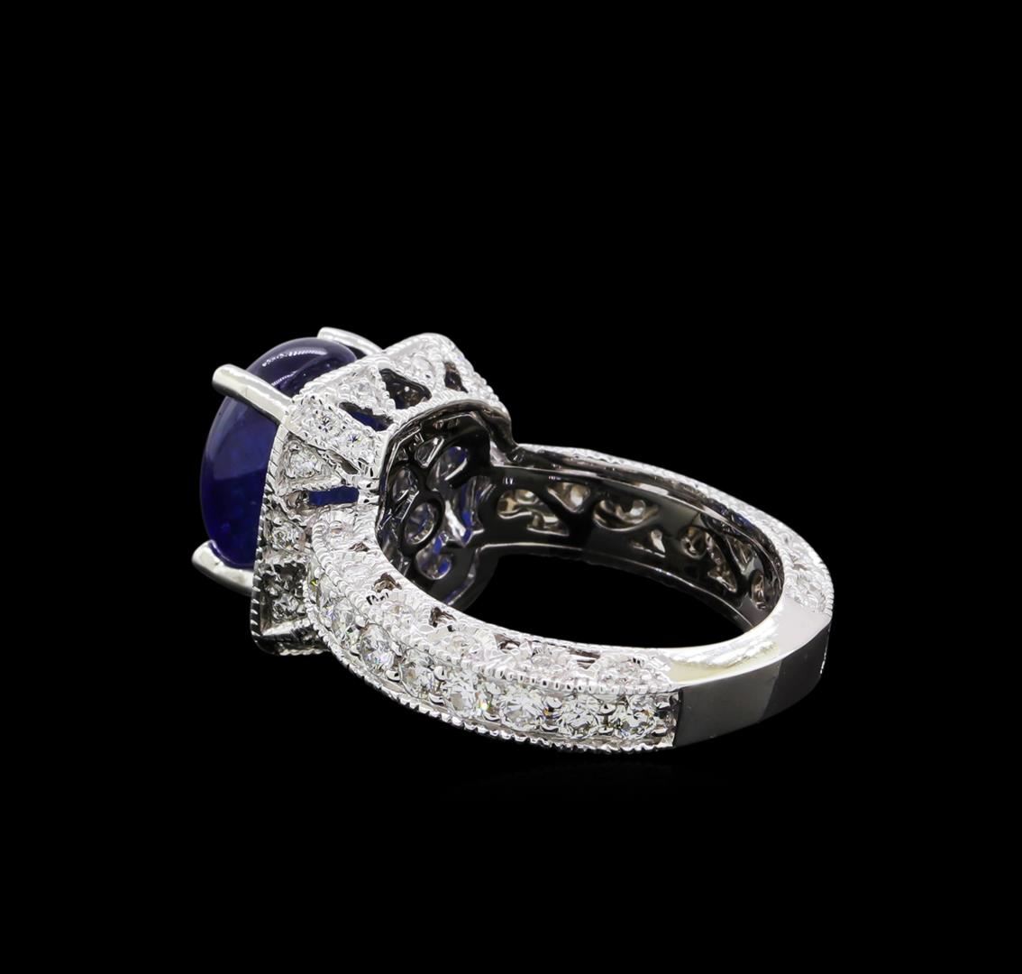 One electronically tested 14KT white gold lady's cast fashion vintage ring with a cathedral basket halo with a bright polish with milgrain detailing finish. The featured lady's ring has a shank measuring 4.28 millimeters in width. Identified with markings of "14K". Condition is new, good workmanship. Containing: One prong set oval cabochon cut natural blue sapphire, measuring 11.20 x 9.25 x 5.64mm, (depth est.) 5%. bulge factor, approximate weight of 6.48ct., clarity is eye clean, medium dark, strong, blue color, (GIA B 6/5), cut is very good. Graded loose prior to setting in the GIA Laboratory, Report #7221210490. No indication of heat. Geographic origin Burma. Transmitting light somewhat diffusely, transparent to translucent.Eighteen prong set round brilliant cut diamonds, measuring 2.35 - 2.30 x 1.44mm (depth est.) approximate total weight of 18 Stones = 0.85ct. Graded in the setting. Clarity: VS-2 to SI-1. Color: H - ICut Very Good Twenty prong set round brilliant cut diamonds, measuring 1.70 - 1.65 x 1.04mm (depth est.) approximate total weight of 20 Stones = 0.36ct. Graded in the setting. Clarity: VS-1 to SI-1. Color: G - HCut Good Forty-Two prong set round brilliant cut diamonds, measuring 1.30 - 1.20 x 0.78mm (depth est.) approximate total weight of 42 Stones = 0.31ct. Graded in the setting. Clarity: VS-2 to SI-1. Color: G - HCut Good. Total Weight of Colored Stones 6.48ct. Total Weight of Diamonds 1.52ct. Total Weight of Ring 9.10gm. GAS Appraised.