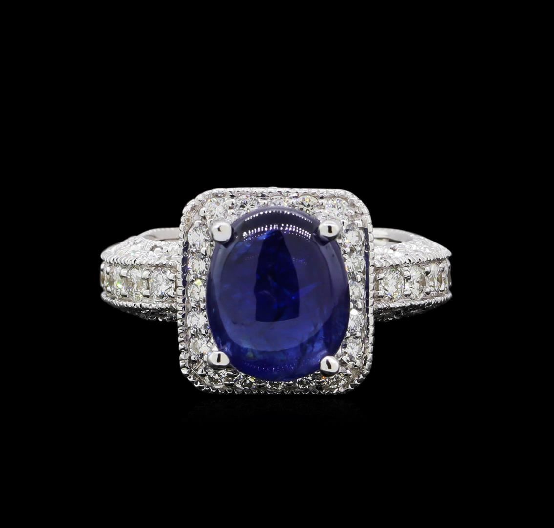 One electronically tested 14KT white gold lady's cast fashion vintage ring with a cathedral basket halo with a bright polish with milgrain detailing finish. The featured lady's ring has a shank measuring 4.28 millimeters in width. Identified with markings of "14K". Condition is new, good workmanship. Containing: One prong set oval cabochon cut natural blue sapphire, measuring 11.20 x 9.25 x 5.64mm, (depth est.) 5%. bulge factor, approximate weight of 6.48ct., clarity is eye clean, medium dark, strong, blue color, (GIA B 6/5), cut is very good. Graded loose prior to setting in the GIA Laboratory, Report #7221210490. No indication of heat. Geographic origin Burma. Transmitting light somewhat diffusely, transparent to translucent.Eighteen prong set round brilliant cut diamonds, measuring 2.35 - 2.30 x 1.44mm (depth est.) approximate total weight of 18 Stones = 0.85ct. Graded in the setting. Clarity: VS-2 to SI-1. Color: H - ICut Very Good Twenty prong set round brilliant cut diamonds, measuring 1.70 - 1.65 x 1.04mm (depth est.) approximate total weight of 20 Stones = 0.36ct. Graded in the setting. Clarity: VS-1 to SI-1. Color: G - HCut Good Forty-Two prong set round brilliant cut diamonds, measuring 1.30 - 1.20 x 0.78mm (depth est.) approximate total weight of 42 Stones = 0.31ct. Graded in the setting. Clarity: VS-2 to SI-1. Color: G - HCut Good. Total Weight of Colored Stones 6.48ct. Total Weight of Diamonds 1.52ct. Total Weight of Ring 9.10gm. GAS Appraised.