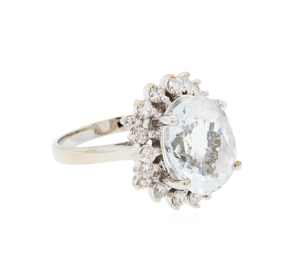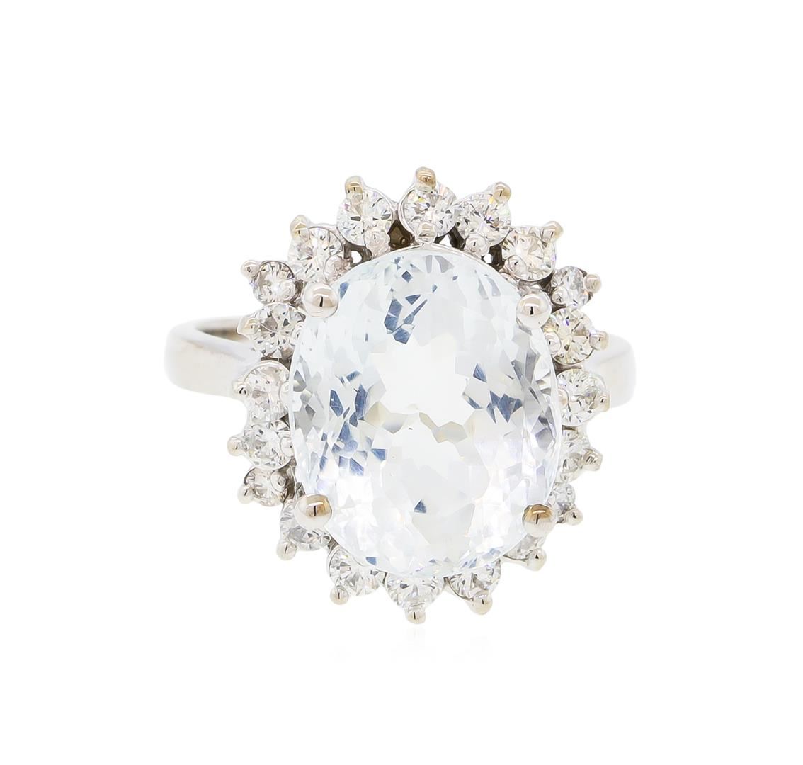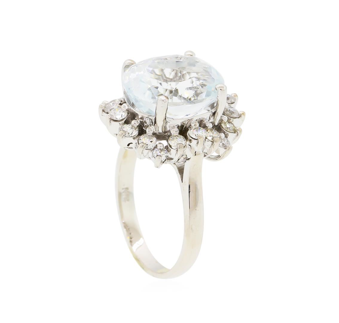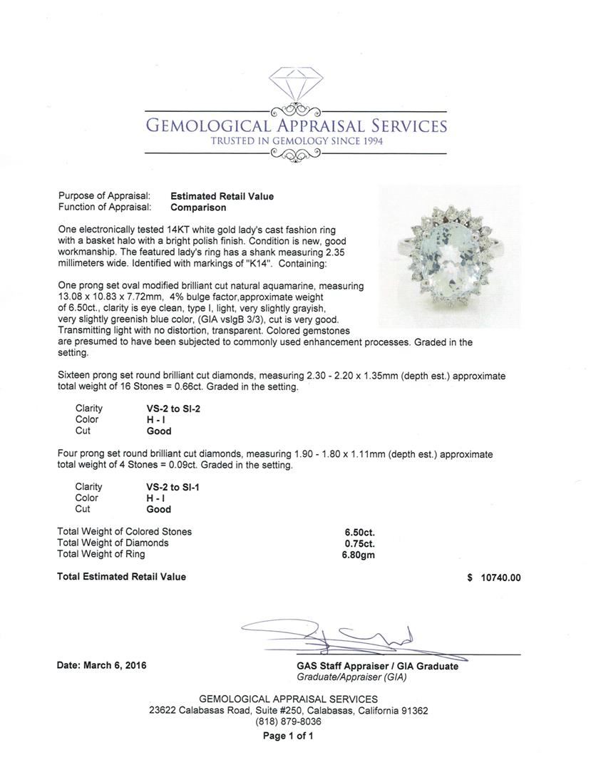 One electronically tested 14KT white gold lady's cast fashion ring with a basket halo with a bright polish finish. The featured lady's ring has a shank measuring 2.35 millimeters wide. Identified with markings of "K14". Condition is new, good workmanship. Containing: One prong set oval modified brilliant cut natural aquamarine, measuring 13.08 x 10.83 x 7.72mm, 4%. bulge factor, approximate weight of 6.50ct., clarity is eye clean, type I, light, very slightly grayish, very slightly greenish blue color, (GIA vslgB 3/3), cut is very good. Transmitting light with no distortion, transparent. Colored gemstones are presumed to have been subjected to commonly used enhancement processes. Graded in the setting. Sixteen prong set round brilliant cut diamonds, measuring 2.30 - 2.20 x 1.35mm (depth est.) approximate total weight of 16 Stones = 0.66ct. Graded in the setting. Clarity: VS-2 to SI-2. Color: H - I, Cut Good Four prong set round brilliant cut diamonds, measuring 1.90 - 1.80 x 1.11mm (depth est.) approximate total weight of 4 Stones = 0.09ct. Graded in the setting. Clarity: VS-2 to SI-1. Color: H - I, Cut Good. Total Weight of Colored Stones 6.50ct. Total Weight of Diamonds 0.75ct. Total Weight of Ring 6.80gm. GAS Appraised at $10,740.00.