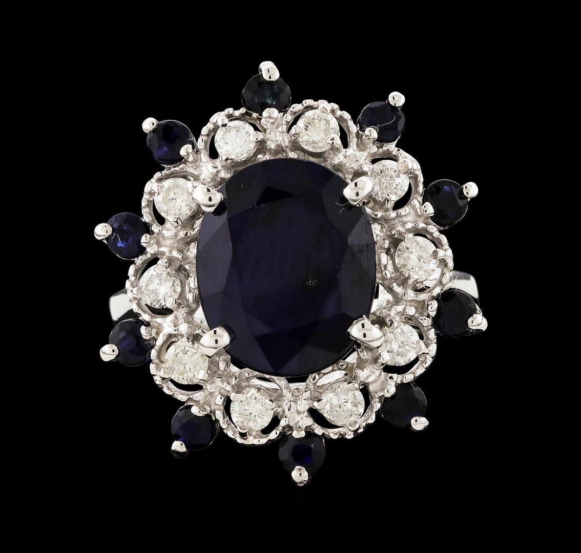 Fourteen karat (14K) white gold sapphire and diamond ring. An oval cut sapphire corundum gemstone is prong mounted in the center of the ring. Round brilliant cut diamonds and sapphire corundum gemstones accent the ring around the center gemstone. The ring is cast stamped "14K" and has a gross weight of 6.6 Grams. Sapphire with a total weight of 6.61cts. Diamonds with a total weight of 0.48cts. with a clarity of (I1) and a color of (H-I). Total weight of the ring is 6.6 grams. GA Appraised at $4,180.00.