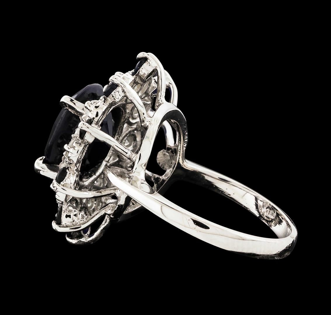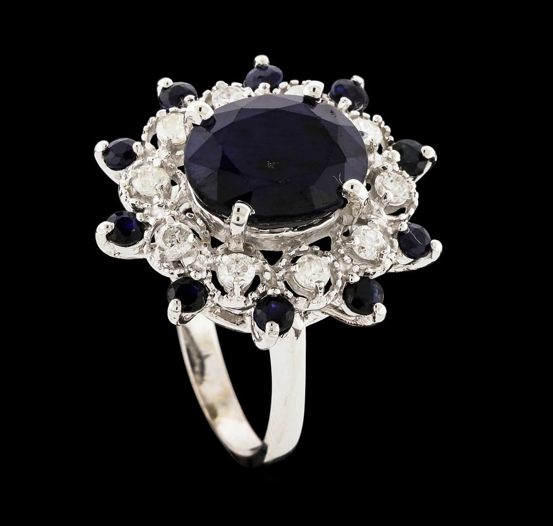 Fourteen karat (14K) white gold sapphire and diamond ring. An oval cut sapphire corundum gemstone is prong mounted in the center of the ring. Round brilliant cut diamonds and sapphire corundum gemstones accent the ring around the center gemstone. The ring is cast stamped "14K" and has a gross weight of 6.6 Grams. Sapphire with a total weight of 6.61cts. Diamonds with a total weight of 0.48cts. with a clarity of (I1) and a color of (H-I). Total weight of the ring is 6.6 grams. GA Appraised at $4,180.00.