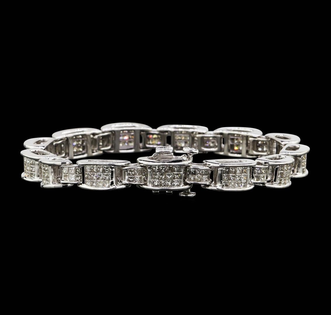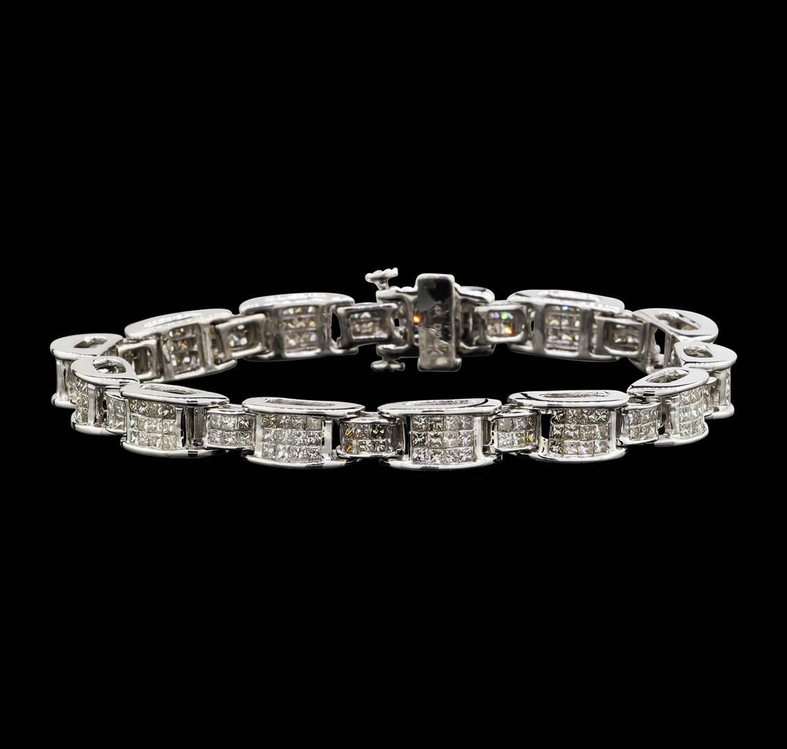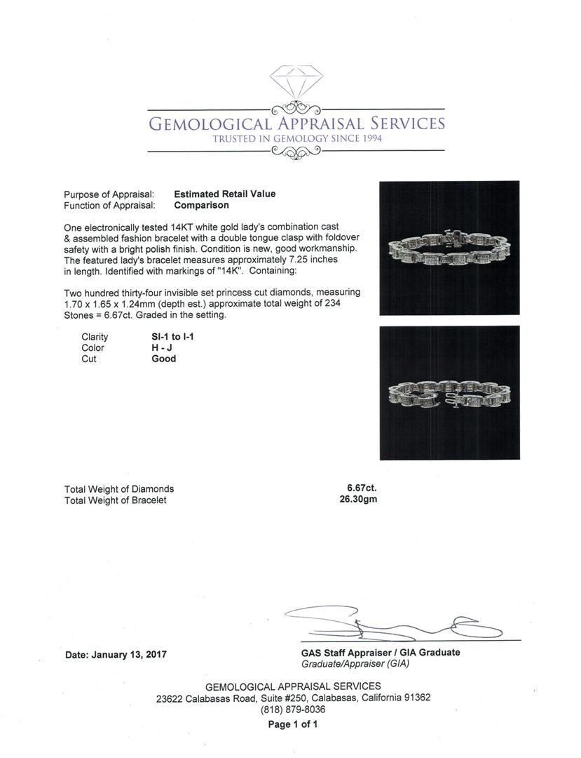 One electronically tested 14KT white gold lady's combination cast & assembled fashion bracelet with a double tongue clasp with foldover safety with a bright polish finish. The featured lady's bracelet measures approximately 7.25 inches in length. Identified with markings of "14K". Condition is new, good workmanship. Containing: Two Hundred Thirty-Four invisible set princess cut diamonds, measuring 1.70 x 1.65 x 1.24mm (depth est.) approximate total weight of 234 Stones = 6.67ct. Graded in the setting. Clarity: SI-1 to I-1. Color: H - JCut Good. Total Weight of Diamonds 6.67ct. Total Weight of Bracelet 26.30gm. GAS Appraised.