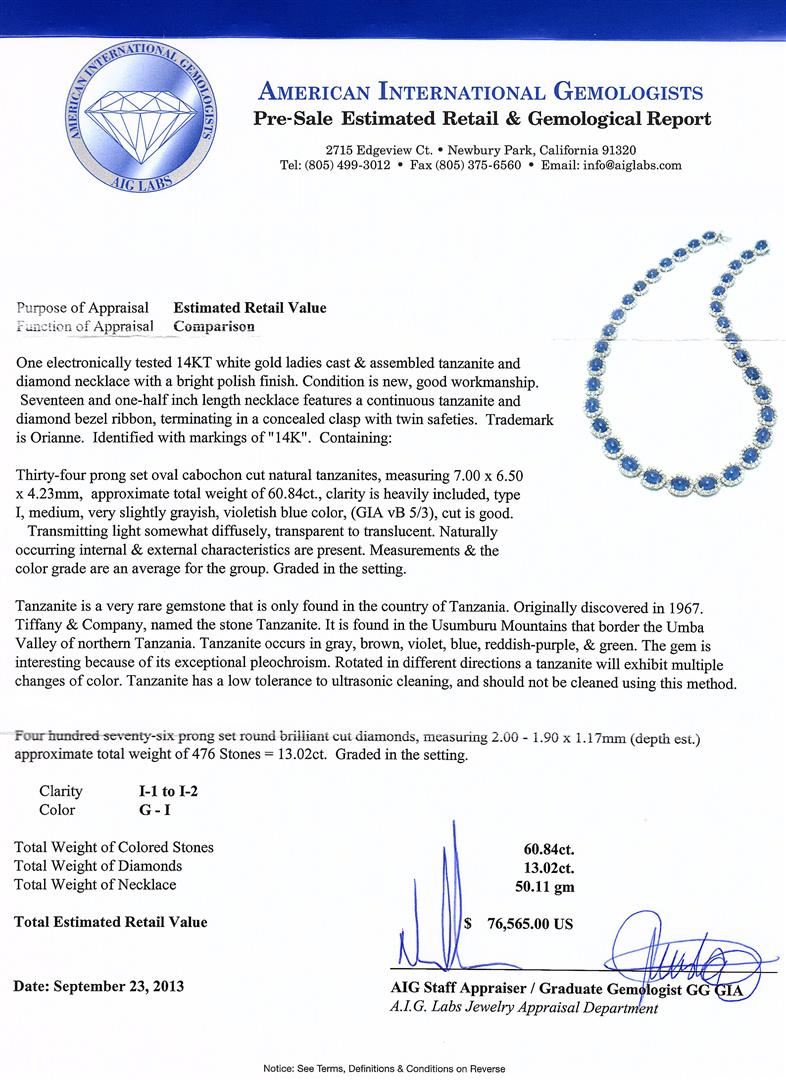 One electronically tested 14KT white gold ladies cast & assembled tanzanite and diamond necklace with a bright polish finish. Seventeen and one-half inch length necklace features a continuous tanzanite and diamond bezel ribbon, terminating in a concealed clasp with twin safeties. Trademark is Orianne. Identified with markings of "14K". Condition is new, good workmanship. Containing: Thirty-four prong set oval cabochon cut natural tanzanites, measuring 7.00 x 6.50 x 4.23mm, approximate. Total Weight of 60.84ct., clarity is heavily included, type I, medium, very slightly grayish, violetish blue color, (GIA vB 5/3), cut is good. Transmitting light somewhat diffusely, transparent to translucent. Naturallyoccurring internal & external characteristics are present. Measurements & thecolor grade are an average for the group. Graded in the setting.Tanzanite is a very rare gemstone that is only found in the country of Tanzania. Originally discovered in 1967. Tiffany & Company, named the stone Tanzanite. It is found in the Usumburu Mountains that border the Umba Valley of northern Tanzania. Tanzanite occurs in gray, brown, violet, blue, reddish-purple, & green. The gem is interesting because of its exceptional pleochroism. Rotated in different directions a tanzanite will exhibit multiple changes of color. Tanzanite has a low tolerance to ultrasonic cleaning, and should not be cleaned using this method.Four Hundred Seventy-Six prong set round brilliant cut diamonds, measuring 2.00 - 1.90 x 1.17mm (depth est.) approximate. Total Weight of 476 Stones = 13.02ct. Graded in the setting. Clarity: I-1 to I-2. Color: G - I. Total Weight of Colored Stones 60.84ct. Total Weight of Diamonds 13.02ct. AIG Appraised at $76,565.00.