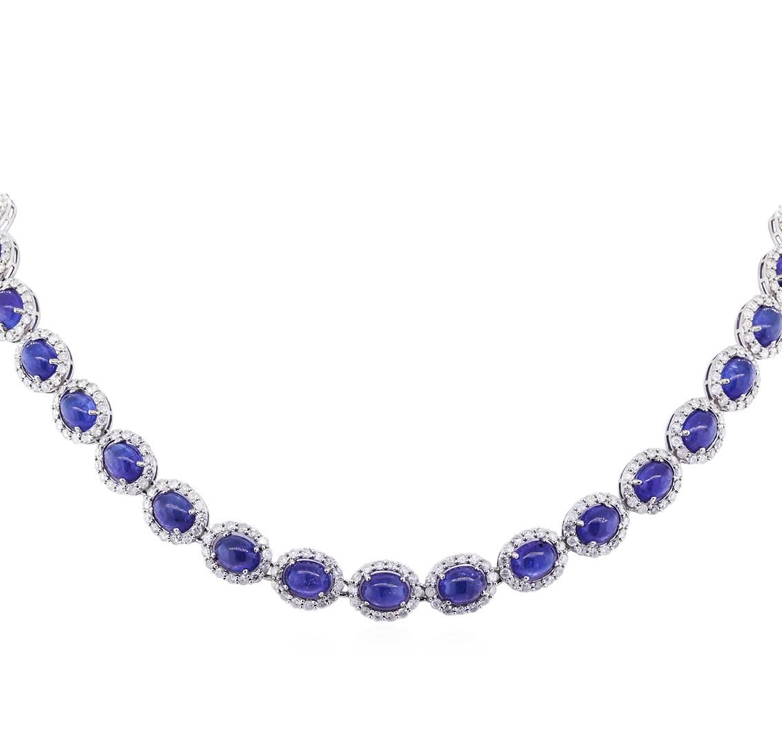 One electronically tested 14KT white gold ladies cast & assembled tanzanite and diamond necklace with a bright polish finish. Seventeen and one-half inch length necklace features a continuous tanzanite and diamond bezel ribbon, terminating in a concealed clasp with twin safeties. Trademark is Orianne. Identified with markings of "14K". Condition is new, good workmanship. Containing: Thirty-four prong set oval cabochon cut natural tanzanites, measuring 7.00 x 6.50 x 4.23mm, approximate. Total Weight of 60.84ct., clarity is heavily included, type I, medium, very slightly grayish, violetish blue color, (GIA vB 5/3), cut is good. Transmitting light somewhat diffusely, transparent to translucent. Naturallyoccurring internal & external characteristics are present. Measurements & thecolor grade are an average for the group. Graded in the setting.Tanzanite is a very rare gemstone that is only found in the country of Tanzania. Originally discovered in 1967. Tiffany & Company, named the stone Tanzanite. It is found in the Usumburu Mountains that border the Umba Valley of northern Tanzania. Tanzanite occurs in gray, brown, violet, blue, reddish-purple, & green. The gem is interesting because of its exceptional pleochroism. Rotated in different directions a tanzanite will exhibit multiple changes of color. Tanzanite has a low tolerance to ultrasonic cleaning, and should not be cleaned using this method.Four Hundred Seventy-Six prong set round brilliant cut diamonds, measuring 2.00 - 1.90 x 1.17mm (depth est.) approximate. Total Weight of 476 Stones = 13.02ct. Graded in the setting. Clarity: I-1 to I-2. Color: G - I. Total Weight of Colored Stones 60.84ct. Total Weight of Diamonds 13.02ct. AIG Appraised at $76,565.00.