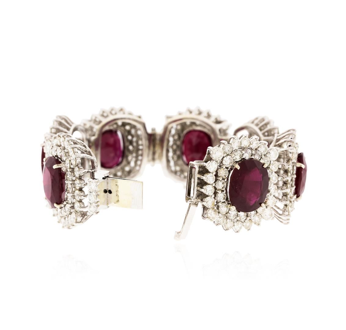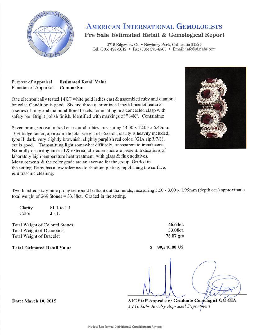 One electronically tested 14KT white gold ladies cast & assembled ruby and diamond bracelet. Six and three-quarter inch length bracelet features a series of ruby and diamond floret bezels, terminating in a concealed clasp with safety bar. Bright polish finish. Identified with markings of "14K". Condition is good. Containing: Seven prong set oval mixed cut natural rubies, measuring 14.00 x 12.00 x 6.40mm, 10% bulge factor, approximate total weight of 66.64ct., clarity is heavily included, type II, dark, very slightly brownish, slightly purplish red color, (GIA slpR 7/3), cut is good. Transmitting light somewhat diffusely, transparent to translucent. Naturally occurring internal & external characteristics are present. Indications of laboratory high temperature heat treatment, with glass & flux additives. Measurements & the color grade are an average for the group. Graded in the setting. Ruby has a low tolerance to rhodium plating, repolishing the surface,& ultrasonic cleaning. Two Hundred Sixty-Nine prong set round brilliant cut diamonds, measuring 3.50 - 3.00 x 1.95mm (depth est.) approximate total weight of 269 Stones = 33.88ct. Graded in the setting. Clarity: SI-1 to I-1. Color: J - L. Total Weight of Colored Stones 66.64ct. Total Weight of Diamonds 33.88ct. Total Weight of Bracelet 76.87 grams. AIG Appraised at $99,540.00.