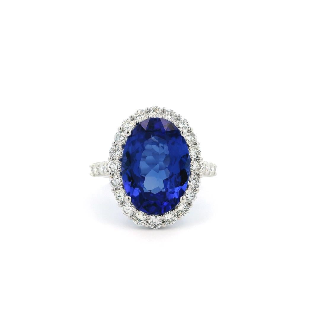One electronically tested 14KT white gold lady's combination cast & assembled fashion oval halo ring with a cathedral shank and basket motif with a bright polish finish. The featured lady's ring has a shank measuring 2.3 millimeters in width. Trademark is UCG. Identified with markings of "14K". Condition is new, good workmanship. Containing: One prong set oval modified brilliant cut natural tanzanite, measuring 15.10 x 10.70 x 6.30mm, (depth est.) approximate weight of 7.16ct., clarity is eye clean, medium dark, strong, violetish blue color, (GIA vB 6/5), cut is very good. Transmitting light with no distortion, transparent. Colored gemstones are presumed to have been subjected to commonly used enhancement processes. Graded in the setting. Twenty-Eight prong set round brilliant cut diamonds, measuring 2.30 - 2.25 x 1.41mm (depth est.) approximate total weight of 28 Stones = 1.32ct. Graded in the setting. Color: G - H. Clarity: VS-1 to SI-1. Cut: Very Good. Total Weight of Colored Stones: 7.16ct. Total Weight of Diamonds: 1.32ct. Total Weight of Ring: 5.50gm. Appraised by Gemological Appraisal Services. GAS Appraised.