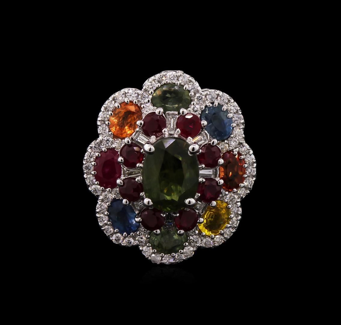 One electronically tested 14KT white gold ladies cast multi color gemstone and diamond ring with a bright polish finish. The ring features a green sapphire set within an inner ruby and diamond bezel and an outer multi color sapphire and diamond floret bezel supported by diamond set shoulders, completed by a three millimeter wide band. Identified with markings of "K14". Condition is new, good workmanship. Containing: One prong set oval mixed cut natural green sapphire, measuring 9.40 x 7.00 x 3.70mm, 20% bulge factor, exact weight 2.67ct., clarity is moderately included, type II, medium dark, very slightly grayish, slightly yellowish green color, (GIA slyG 6/3), cut is good. Transmitting light somewhat diffusely, transparent to translucent. Naturally occurring internal & external characteristics are present. Graded in the setting. Sixteen prong set round and oval mixed cut natural ruby and multi color sapphires exact total weight 4.54ct. Clarity is slightly included to moderately included, cut is good. Transmitting light somewhat diffusely, transparent to translucent. Naturally occurring internal & external characteristics are present. The group is composed of a mix of natural blue, orange, green and yellow color sapphires and red color rubies. Graded in the setting. Seventy prong set round brilliant & baguette cut diamonds exact total weight 70 Stones = 0.97ct. Graded in the setting. Clarity: VS-2 to SI-2. Color: G - I. Total Weight of Colored Stones 7.21ct. Total Weight of Diamonds 0.97ct. Total Weight of Ring 11.95gm. AIG Appraised at $8,765.00.