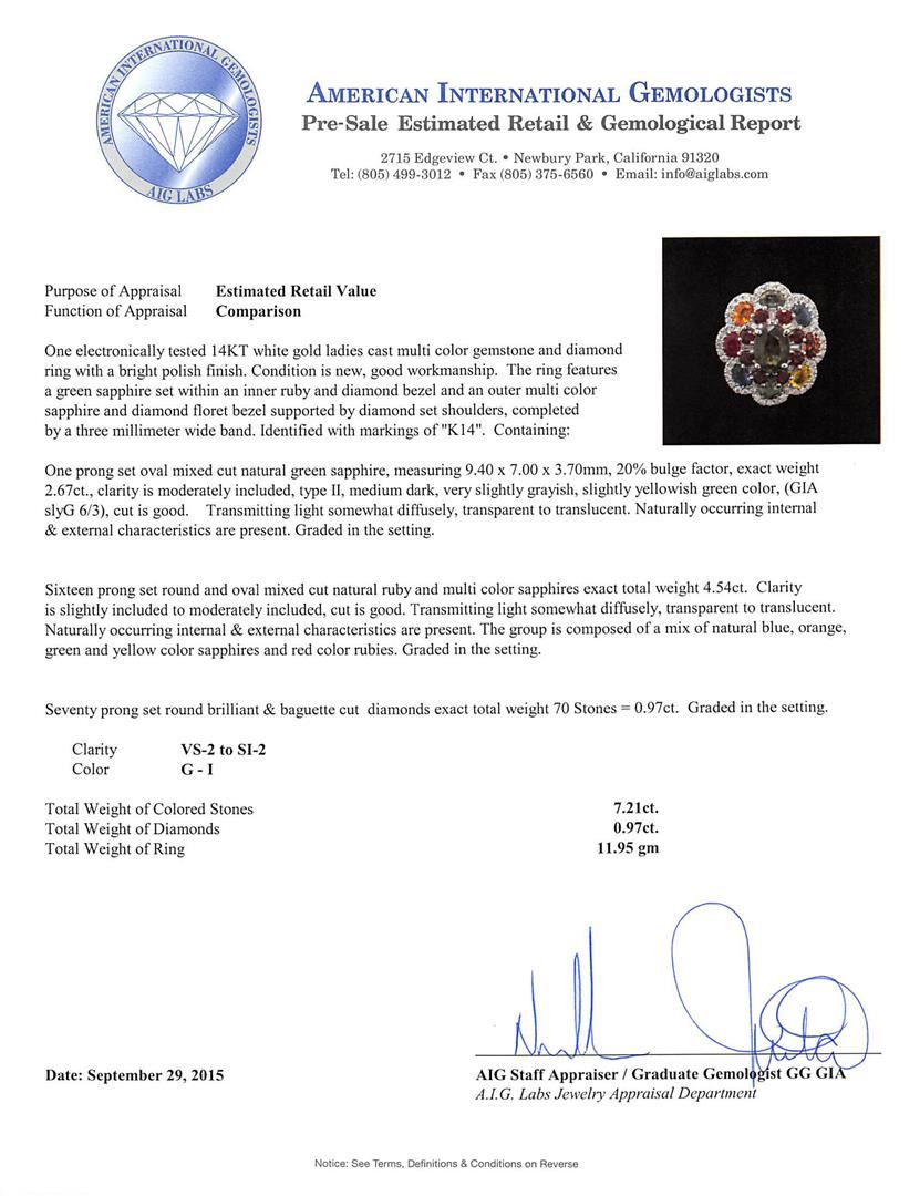 One electronically tested 14KT white gold ladies cast multi color gemstone and diamond ring with a bright polish finish. The ring features a green sapphire set within an inner ruby and diamond bezel and an outer multi color sapphire and diamond floret bezel supported by diamond set shoulders, completed by a three millimeter wide band. Identified with markings of "K14". Condition is new, good workmanship. Containing: One prong set oval mixed cut natural green sapphire, measuring 9.40 x 7.00 x 3.70mm, 20% bulge factor, exact weight 2.67ct., clarity is moderately included, type II, medium dark, very slightly grayish, slightly yellowish green color, (GIA slyG 6/3), cut is good. Transmitting light somewhat diffusely, transparent to translucent. Naturally occurring internal & external characteristics are present. Graded in the setting. Sixteen prong set round and oval mixed cut natural ruby and multi color sapphires exact total weight 4.54ct. Clarity is slightly included to moderately included, cut is good. Transmitting light somewhat diffusely, transparent to translucent. Naturally occurring internal & external characteristics are present. The group is composed of a mix of natural blue, orange, green and yellow color sapphires and red color rubies. Graded in the setting. Seventy prong set round brilliant & baguette cut diamonds exact total weight 70 Stones = 0.97ct. Graded in the setting. Clarity: VS-2 to SI-2. Color: G - I. Total Weight of Colored Stones 7.21ct. Total Weight of Diamonds 0.97ct. Total Weight of Ring 11.95gm. AIG Appraised.