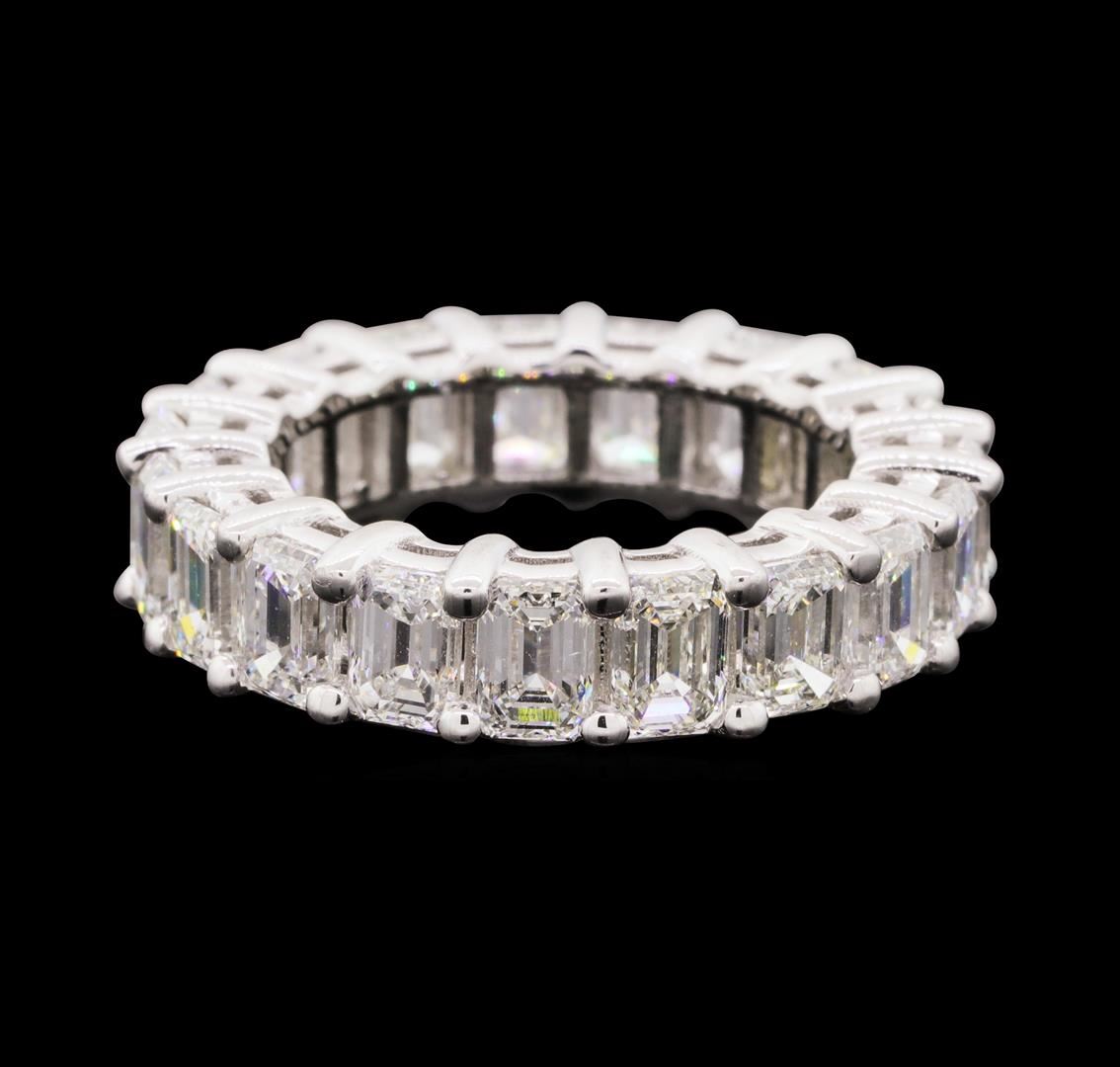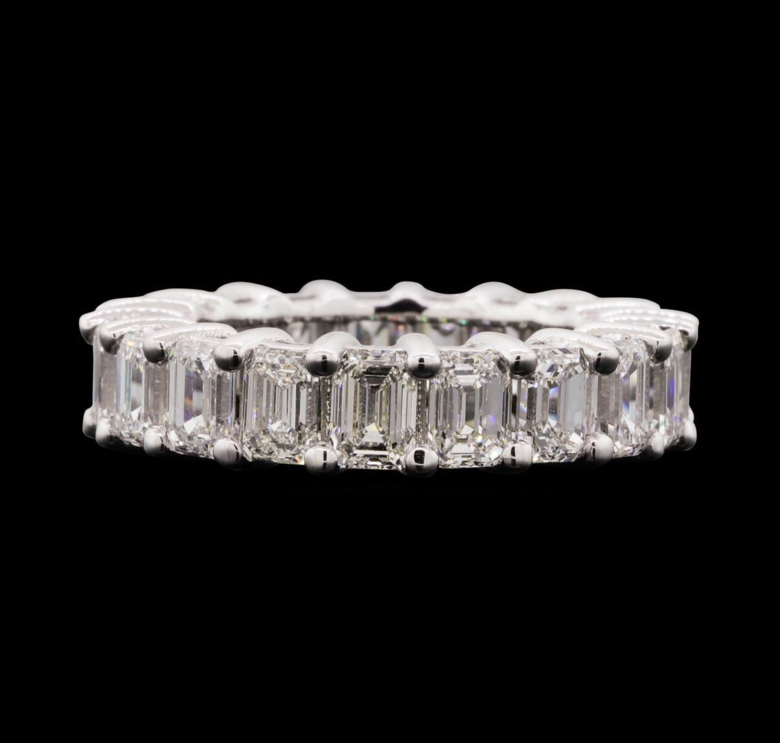 One electronically tested 14KT white gold lady's cast eternity band with a bright polish finish. The featured lady's ring has a shank measuring 5.70 millimeters wide. Identified with markings of "14K". Condition is new, good workmanship. Containing: Nineteen prong set emerald cut diamonds, measuring 4.77 x 3.70 x 2.48mm (depth est.) approximate total weight of 19 Stones = 7.65ct. Graded in the setting. Color H - I Clarity VS-1 to VS-2 Cut Very Good. Total Weight of Diamonds 7.65ct. Total Weight of Band 6.50gm. Size 6.5-7. GAS Appraised.