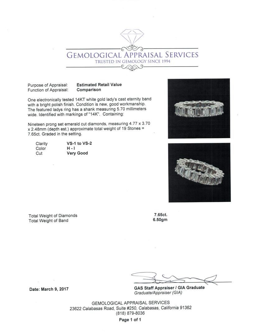 One electronically tested 14KT white gold lady's cast eternity band with a bright polish finish. The featured lady's ring has a shank measuring 5.70 millimeters wide. Identified with markings of "14K". Condition is new, good workmanship. Containing: Nineteen prong set emerald cut diamonds, measuring 4.77 x 3.70 x 2.48mm (depth est.) approximate total weight of 19 Stones = 7.65ct. Graded in the setting. Color H - I Clarity VS-1 to VS-2 Cut Very Good. Total Weight of Diamonds 7.65ct. Total Weight of Band 6.50gm. Size 6.5-7. GAS Appraised.