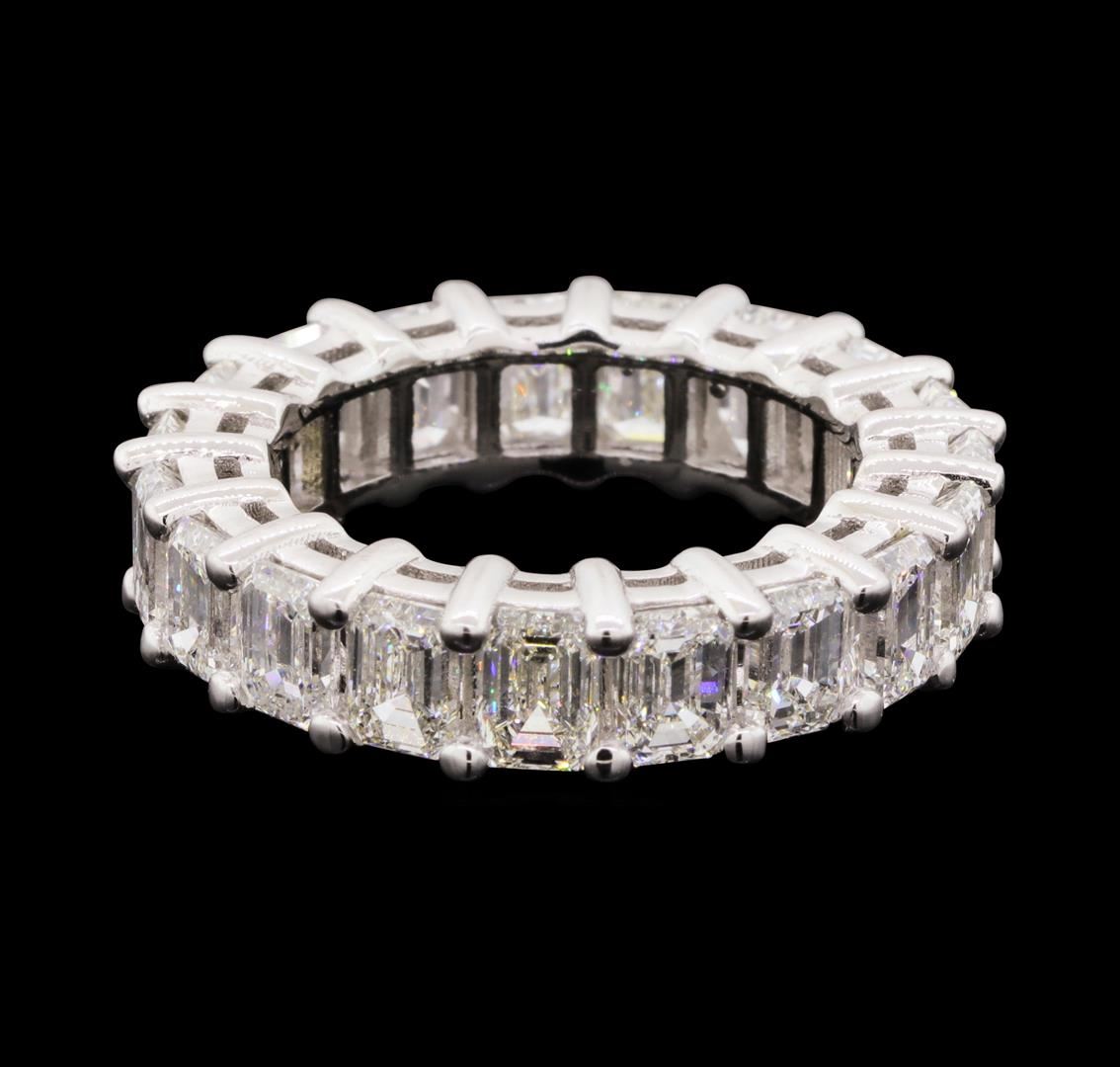 One electronically tested 14KT white gold lady's cast eternity band with a bright polish finish. The featured lady's ring has a shank measuring 5.70 millimeters wide. Identified with markings of "14K". Condition is new, good workmanship. Containing: Nineteen prong set emerald cut diamonds, measuring 4.77 x 3.70 x 2.48mm (depth est.) approximate total weight of 19 Stones = 7.65ct. Graded in the setting. Color H - I Clarity VS-1 to VS-2 Cut Very Good. Total Weight of Diamonds 7.65ct. Total Weight of Band 6.50gm. GAS Appraised.