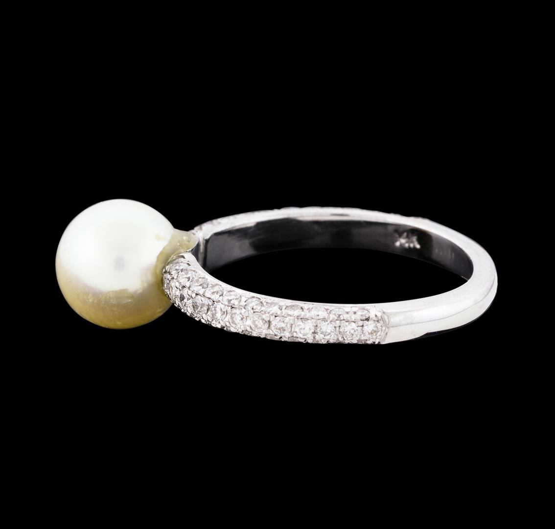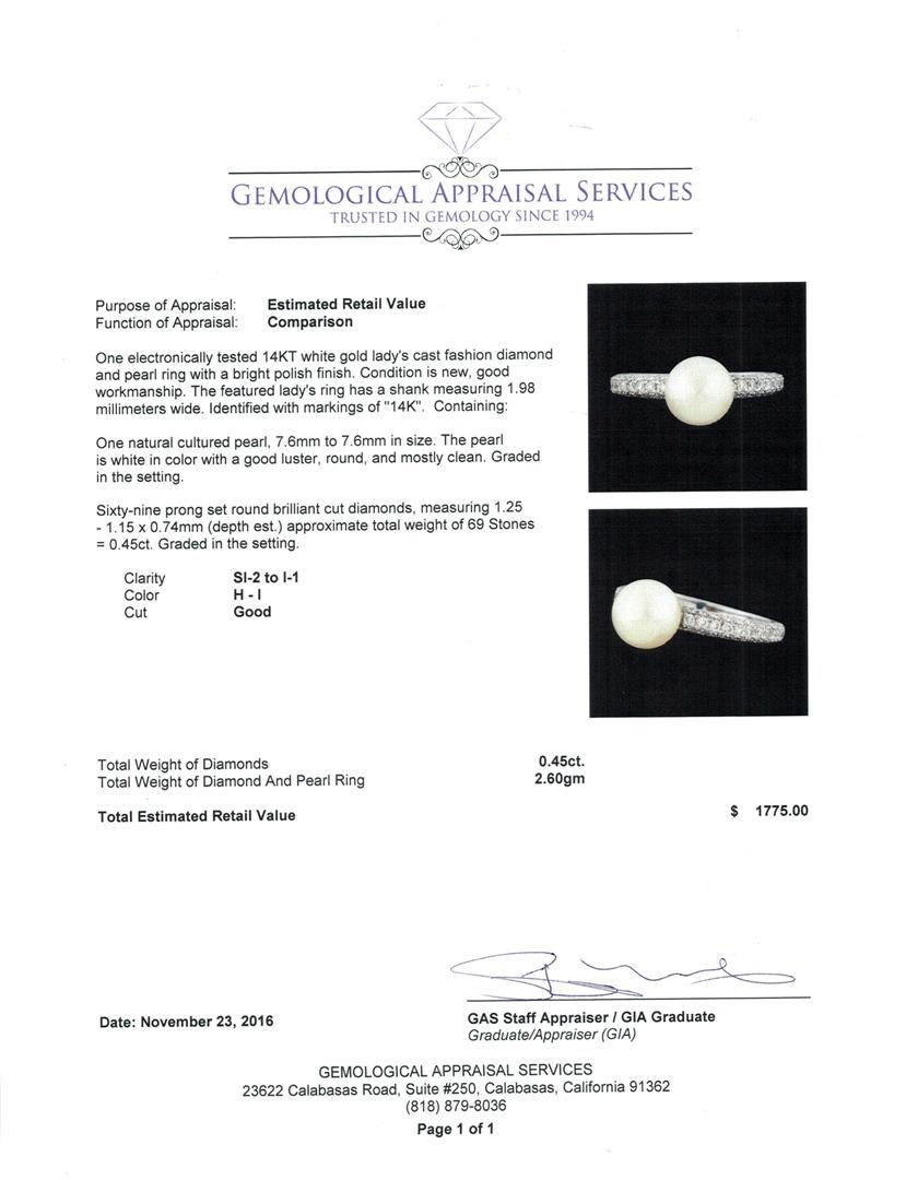 One electronically tested 14KT white gold lady's cast fashion diamond and pearl ring with a bright polish finish. The featured lady's ring has a shank measuring 1.98 millimeters wide. Identified with markings of "14K". Condition is new, good workmanship. Containing: One natural cultured pearl, 7.6mm to 7.6mm in size. The pearl is white in color with a good luster, round, and mostly clean. Graded in the setting. Sixty-Nine prong set round brilliant cut diamonds, measuring 1.25 - 1.15 x 0.74mm (depth est.) approximate total weight of 69 Stones = 0.45ct. Graded in the setting. Clarity: SI-2 to I-1. Color: H - ICut Good. Total Weight of Diamonds 0.45ct. Total Weight of Diamond And Pearl Ring 2.60gm. GAS Appraised at $1,775.00.