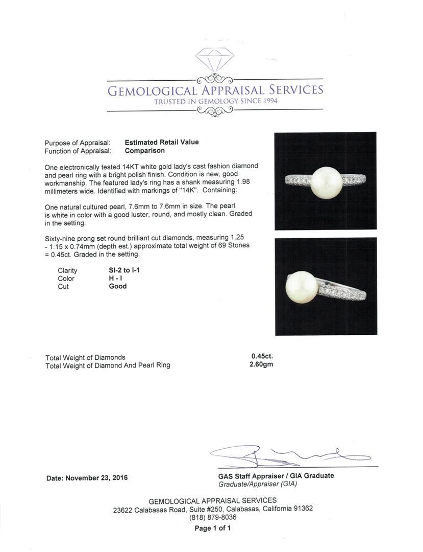 One electronically tested 14KT white gold lady's cast fashion diamond and pearl ring with a bright polish finish. The featured lady's ring has a shank measuring 1.98 millimeters wide. Identified with markings of "14K". Condition is new, good workmanship. Containing: One natural cultured pearl, 7.6mm to 7.6mm in size. The pearl is white in color with a good luster, round, and mostly clean. Graded in the setting. Sixty-Nine prong set round brilliant cut diamonds, measuring 1.25 - 1.15 x 0.74mm (depth est.) approximate total weight of 69 Stones = 0.45ct. Graded in the setting. Clarity: SI-2 to I-1. Color: H - ICut Good. Total Weight of Diamonds 0.45ct. Total Weight of Diamond And Pearl Ring 2.60gm. GAS Appraised.