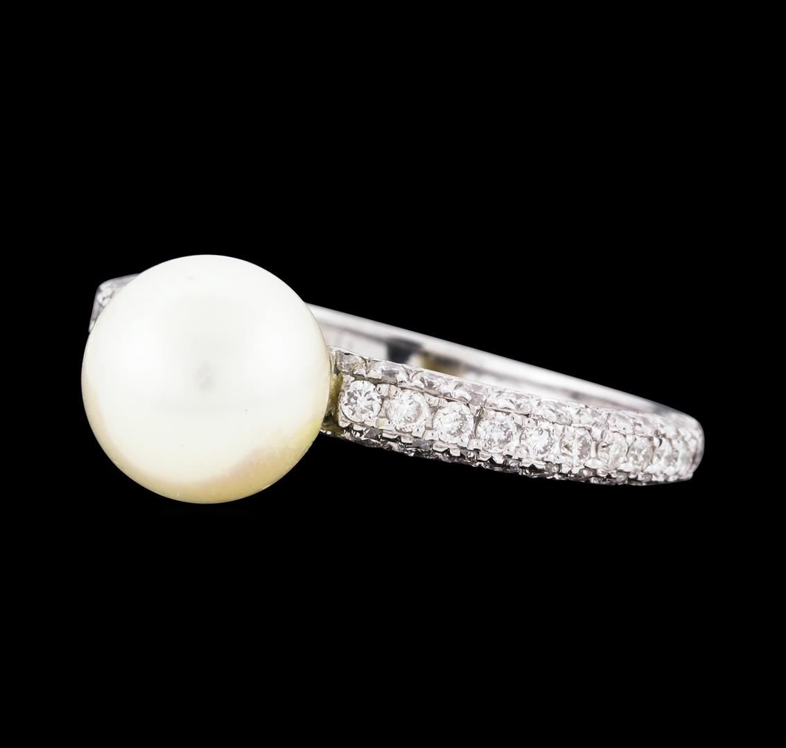 One electronically tested 14KT white gold lady's cast fashion diamond and pearl ring with a bright polish finish. The featured lady's ring has a shank measuring 1.98 millimeters wide. Identified with markings of "14K". Condition is new, good workmanship. Containing: One natural cultured pearl, 7.6mm to 7.6mm in size. The pearl is white in color with a good luster, round, and mostly clean. Graded in the setting. Sixty-Nine prong set round brilliant cut diamonds, measuring 1.25 - 1.15 x 0.74mm (depth est.) approximate total weight of 69 Stones = 0.45ct. Graded in the setting. Clarity: SI-2 to I-1. Color: H - ICut Good. Total Weight of Diamonds 0.45ct. Total Weight of Diamond And Pearl Ring 2.60gm. GAS Appraised.