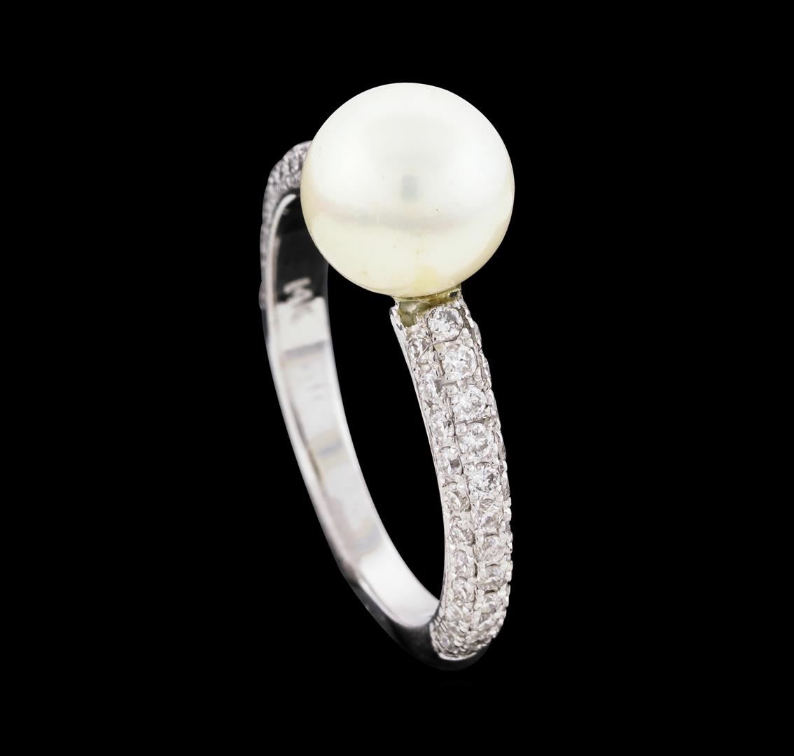 One electronically tested 14KT white gold lady's cast fashion diamond and pearl ring with a bright polish finish. The featured lady's ring has a shank measuring 1.98 millimeters wide. Identified with markings of "14K". Condition is new, good workmanship. Containing: One natural cultured pearl, 7.6mm to 7.6mm in size. The pearl is white in color with a good luster, round, and mostly clean. Graded in the setting. Sixty-Nine prong set round brilliant cut diamonds, measuring 1.25 - 1.15 x 0.74mm (depth est.) approximate total weight of 69 Stones = 0.45ct. Graded in the setting. Clarity: SI-2 to I-1. Color: H - ICut Good. Total Weight of Diamonds 0.45ct. Total Weight of Diamond And Pearl Ring 2.60gm. GAS Appraised.
