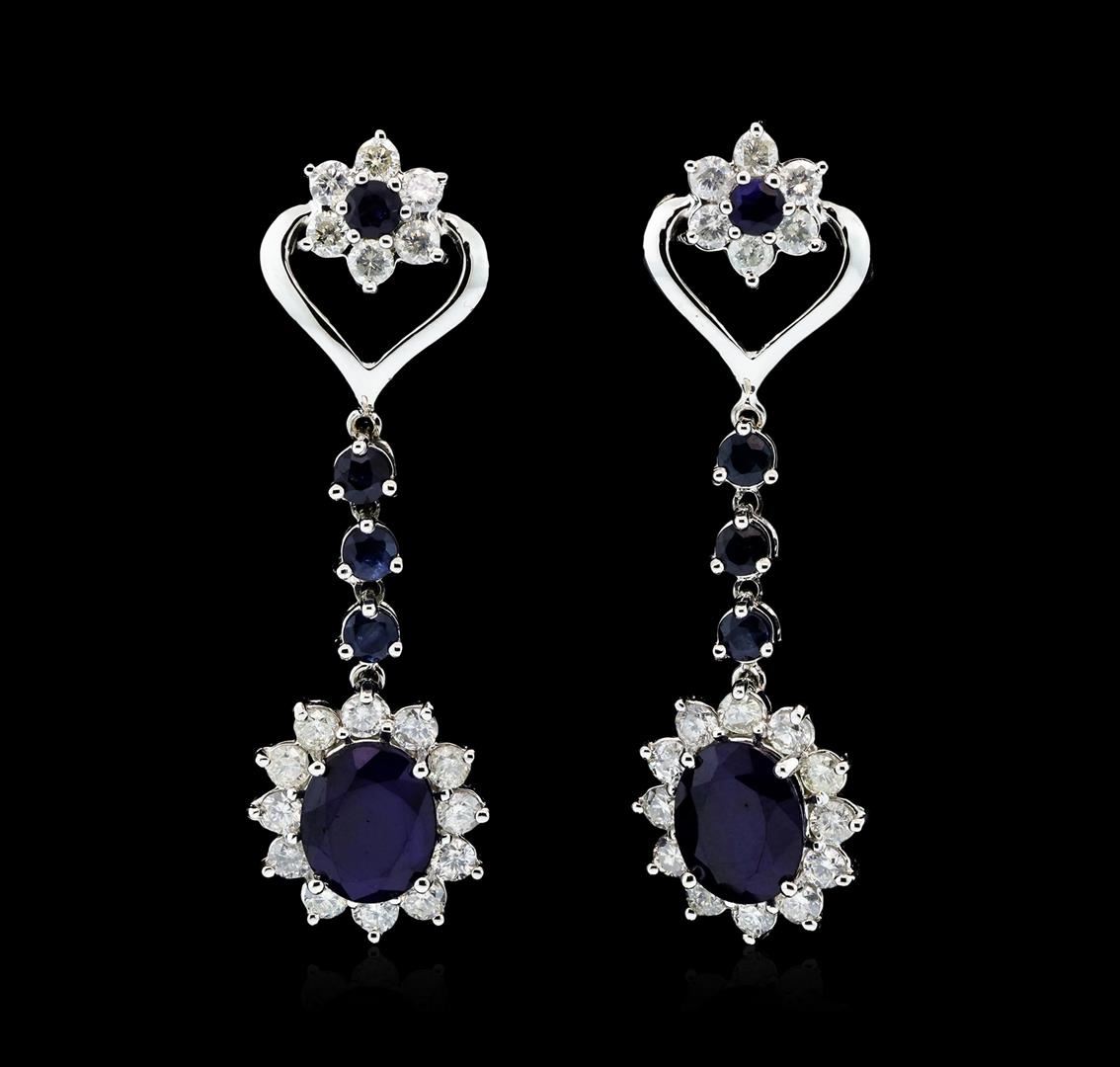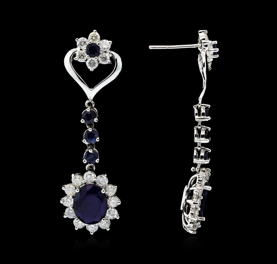 One pair electronically tested 14KT white gold ladies cast & assembled sapphire and diamond dangle earrings with standard backs. Each earring features a sapphire and diamond bezel dangle supported by a sapphire ribbon, completed by a sapphire and diamond floret. Bright polish finish. Condition is new, good workmanship. Containing: Two prong set oval mixed cut natural blue sapphires approximate total weight of 6.57ct., type II, dark, moderately strong, blue color, (GIA B 7/4), cut is good. Transmitting light very diffusely, opaque. Naturally occurring internal & external characteristics are present. Color grade is an average for the pair. Indications of multiple laboratory enhancements, including high temperature diffusion treatment. Graded in the setting.Eight prong set round mixed cut natural blue sapphires approximate total weight of 1.15ct., clarity is moderately included, type II, medium dark, very slightly grayish, blue color, (GIA B 6/3), cut is good. Transmitting light somewhat diffusely, transparent to translucent. Naturally occurring internal & external characteristics are present. Color grade is an average for the group. Indications of laboratory high temperature diffusion treatment. Graded in the setting.Thirty-Six prong set round brilliant cut diamonds approximate total weight of 36 Stones = 2.45ct. Graded in the setting. Clarity: I-1 to I-2. Color: F - H. Total Weight of Colored Stones 7.72ct. Total Weight of Diamonds 2.45ct. Total Weight of Earrings 9.53gm. AIG Appraised.
