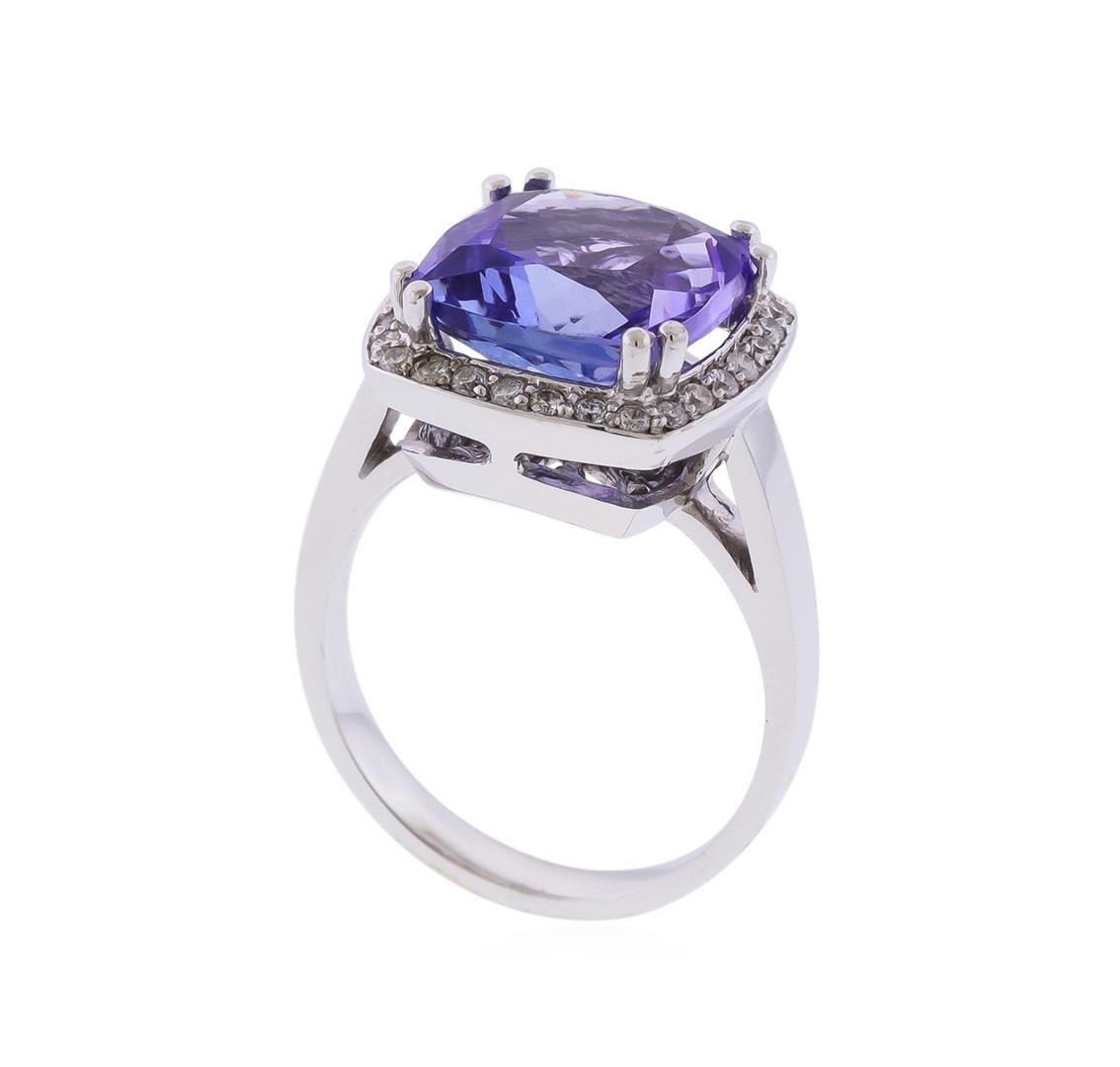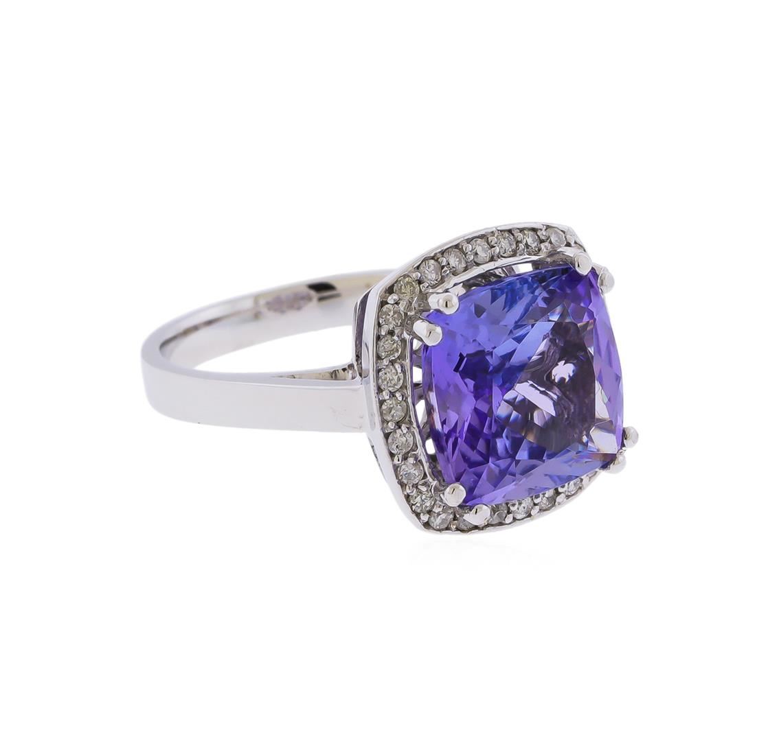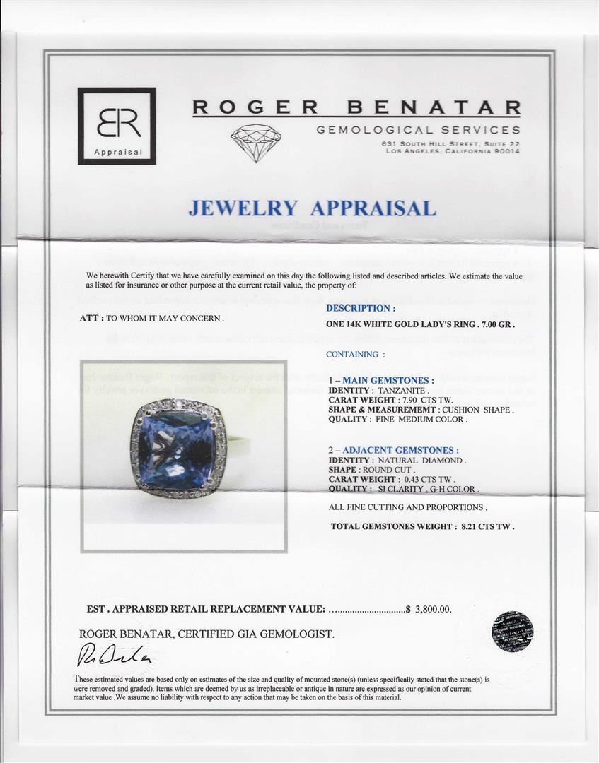 Containing 14KT White Gold Ring weighing approximately 7.00 grams. (1) Cushion Shaped Tanzanite weighing approximately 7.90cts; Surrounded by diamonds weighing approximately 0.43ctw, Clarity: SI Clarity, Color: G-H. RBGS Appraised at $3,800.00.