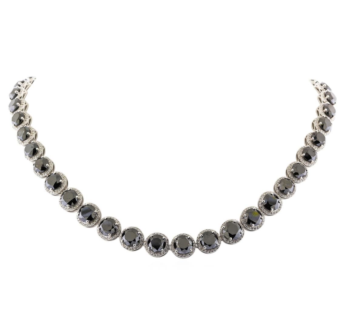 One electronically tested 14KT white gold ladies cast & assembled black and white diamond necklace. Seventeen inch length necklace features a flexible graduating black and white diamond bezel ribbon, terminating in a concealed clasp with twin safeties. Bright polish finish. Trademark is Orianne. Identified with markings of "14K". Condition is new, good workmanship. Containing: Forty-Two prong set round brilliant cut diamonds approximate total weight of 42 Stones = 75.71ct. Indications of multiple laboratory enhancements. The specific gravity of black diamond is 3.120 to 3.165. Diamond tester results are non-reactive. Graded in the setting. Clarity D‚class‚. Color: Fancy Black; Irradiated. Nine Hundred Sixty-Four prong set round brilliant cut diamonds approximate total weight of 964 Stones = 4.02ct. Graded in the setting. Clarity: I-2 to I-3. Color: H - J. Total Weight of Diamonds 79.73ct. Total Weight of Necklace 47.54gm. AIG Appraised at $79,160.00.