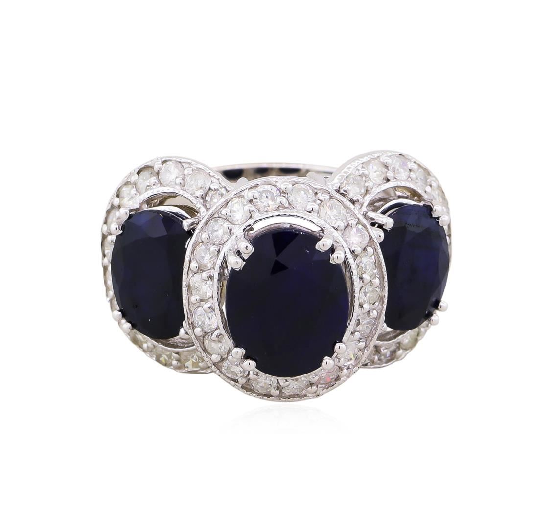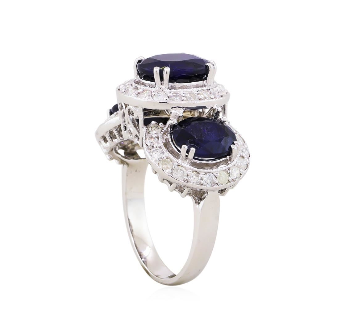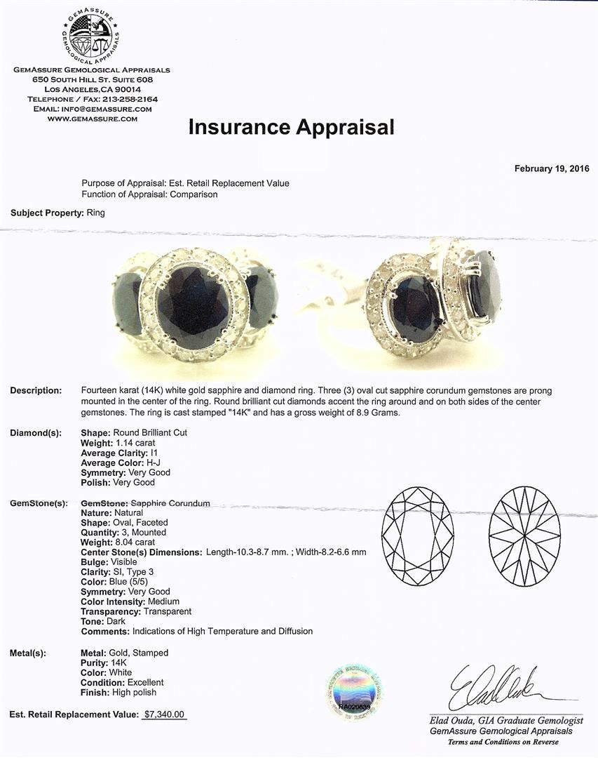 Fourteen Karat (14K) White Gold Sapphire And Diamond Ring. Three (3) Oval Cut Sapphire Corundum Gemstones Are Prong Mounted In The Center Of The Ring. Round Brilliant Cut Diamonds Accent The Ring Around And On Both Sides Of The Center Gemstones. The Ring Is Cast Stamped "14K" And Has A Gross Weight Of 8.9 Grams. Diamonds: Shape: Round Brilliant Cut, Weight: 1.14 Carat, Average Clarity. Il, Average Color: H-J, Symmetry: Very Good, Polish: Very Good Gemstones: Sapphire Corundum, Nature: Natural, Shape: Oval, Faceted, Quantity: 3, Mounted, Weight: 8.04 Carat, Center Stone(S) Dimensions: Length-10.3-8.7 Mm; Width-8.2-6.6 Mm, Bulge: Visible, Clarity: Sl, Type 3, Color: Blue (5/5), Symmetry: Very Good, Color Intensity: Medium, Transparency: Transparent, Tone: Dark. Comments: Indications Of High Temperature And Diffusion. Metal: Gold, Stamped, Purity: 14K, Color: White, Condition: Excellent, Finish: High Polish. GGA Appraised at $7,340.00.