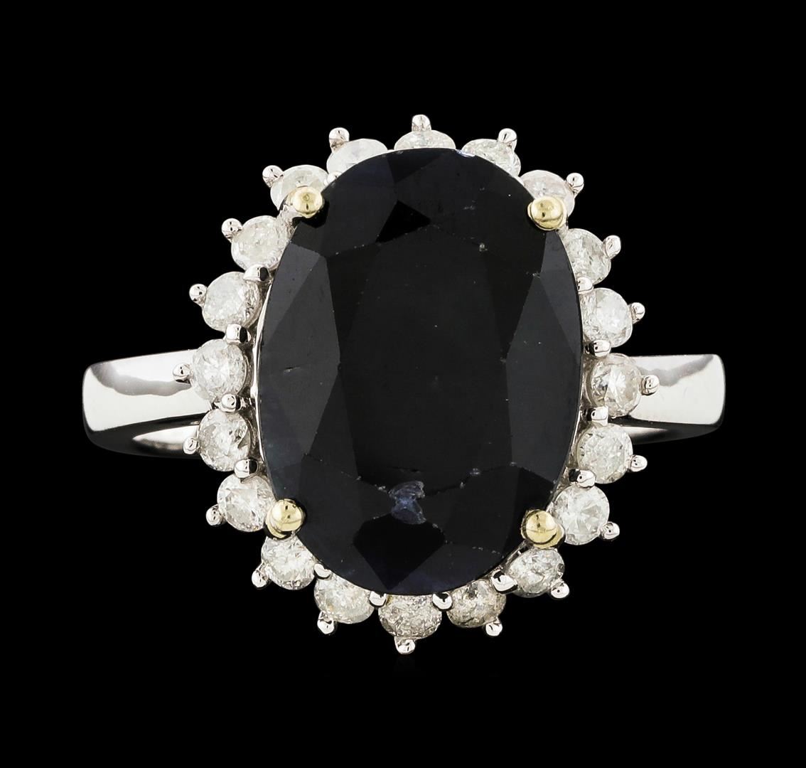 One electronically tested 14KT white gold ladies cast sapphire & diamond ring with a bright finish. The featured sapphire is set within a diamond bezel, supported by a tapering three millimeter wide band. Trademark is Orianne. Identified with markings of "14K". Condition is new, good workmanship. Containing: One prong set oval mixed cut natural blue sapphire, measuring 14.00 x 10.00mm, approximate weight of 8.18ct., clarity is severely included, type Il, dark, very slightly grayish, blue color, (GIA B 7/3), cut is good. Transmitting light somewhat diffusely, translucent. Naturally occurring internal & external characteristics are present. Graded in the setting. Twenty prong set round brilliant cut diamonds, measuring 2.00 - 1.90 x 1.17mm (depth est.) approximate total weight of 20 Stones = 0.63ct. Graded in the setting. Clarity (I-1 to I-2) and color of (G-I). Total weight of colored stone 8.18cts. Total weight of diamonds is 0.63cts. Total weight of the ring is 4.70 grams. AIG Appraised.