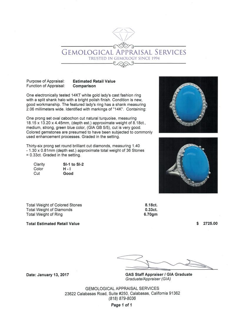 One electronically tested 14KT white gold lady's cast fashion ring with a split shank halo with a bright polish finish. The featured lady's ring has a shank measuring 2.06 millimeters wide. Identified with markings of "14K". Condition is new, good workmanship. Containing: One prong set oval cabochon cut natural turquoise, measuring 18.15 x 13.20 x 4.45mm, (depth est.) approximate weight of 8.18ct., medium, strong, green blue color, (GIA GB 5/5), cut is very good. Colored gemstones are presumed to have been subjected to commonly used enhancement processes. Graded in the setting. Thirty-Six prong set round brilliant cut diamonds, measuring 1.40 - 1.30 x 0.81mm (depth est.) approximate total weight of 36 Stones = 0.33ct. Graded in the setting. Clarity: SI-1 to SI-2. Color: H - ICut Good. Total Weight of Colored Stones 8.18ct. Total Weight of Diamonds 0.33ct. Total Weight of Ring 6.70gm. GAS Appraised at $2,725.00.
