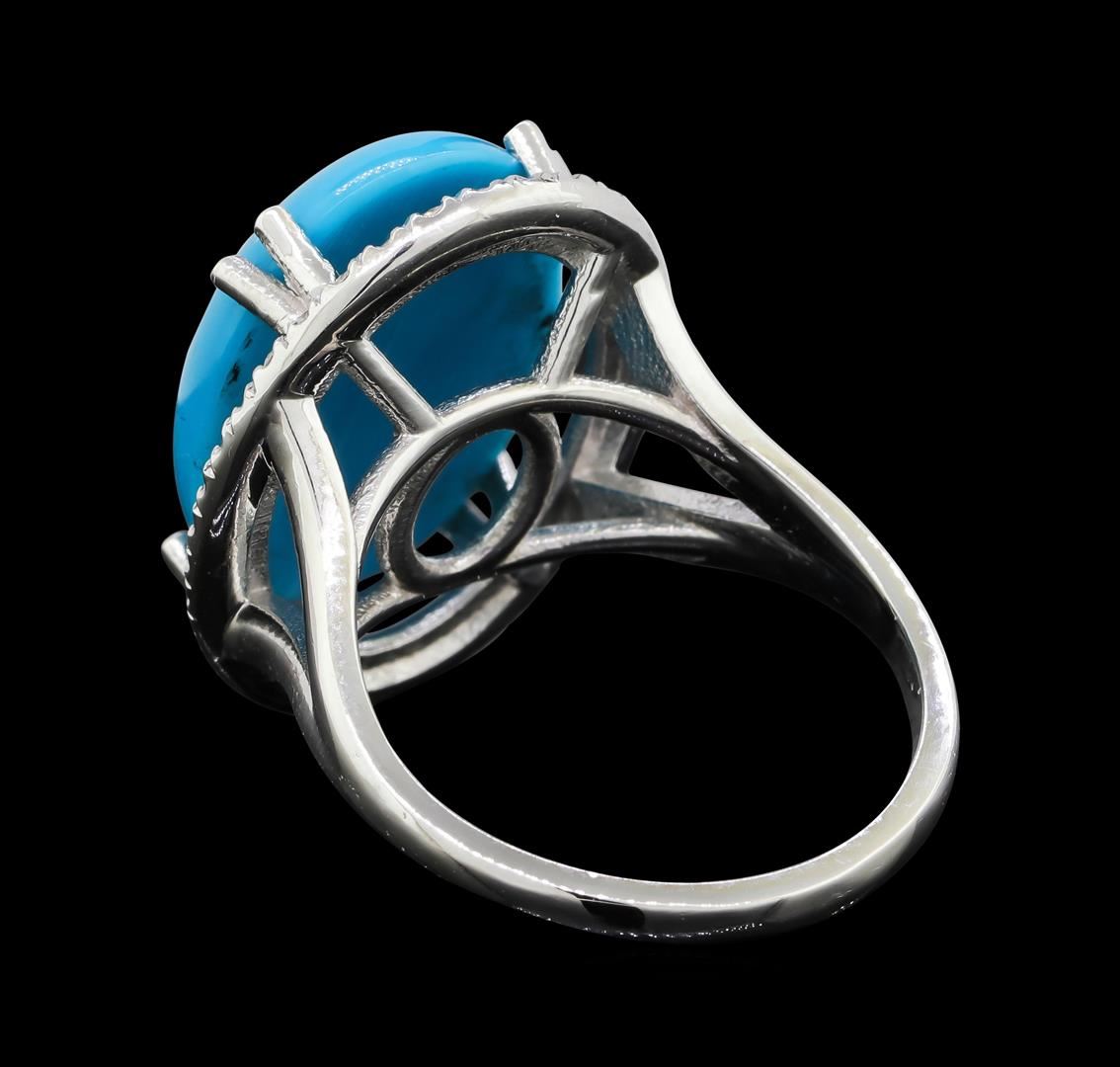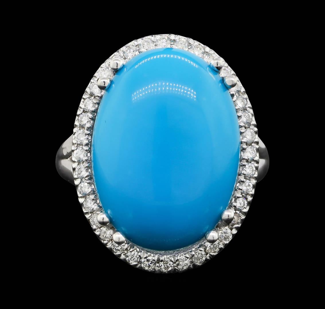 One electronically tested 14KT white gold lady's cast fashion ring with a split shank halo with a bright polish finish. The featured lady's ring has a shank measuring 2.06 millimeters wide. Identified with markings of "14K". Condition is new, good workmanship. Containing: One prong set oval cabochon cut natural turquoise, measuring 18.15 x 13.20 x 4.45mm, (depth est.) approximate weight of 8.18ct., medium, strong, green blue color, (GIA GB 5/5), cut is very good. Colored gemstones are presumed to have been subjected to commonly used enhancement processes. Graded in the setting. Thirty-Six prong set round brilliant cut diamonds, measuring 1.40 - 1.30 x 0.81mm (depth est.) approximate total weight of 36 Stones = 0.33ct. Graded in the setting. Clarity: SI-1 to SI-2. Color: H - ICut Good. Total Weight of Colored Stones 8.18ct. Total Weight of Diamonds 0.33ct. Total Weight of Ring 6.70gm. GAS Appraised.