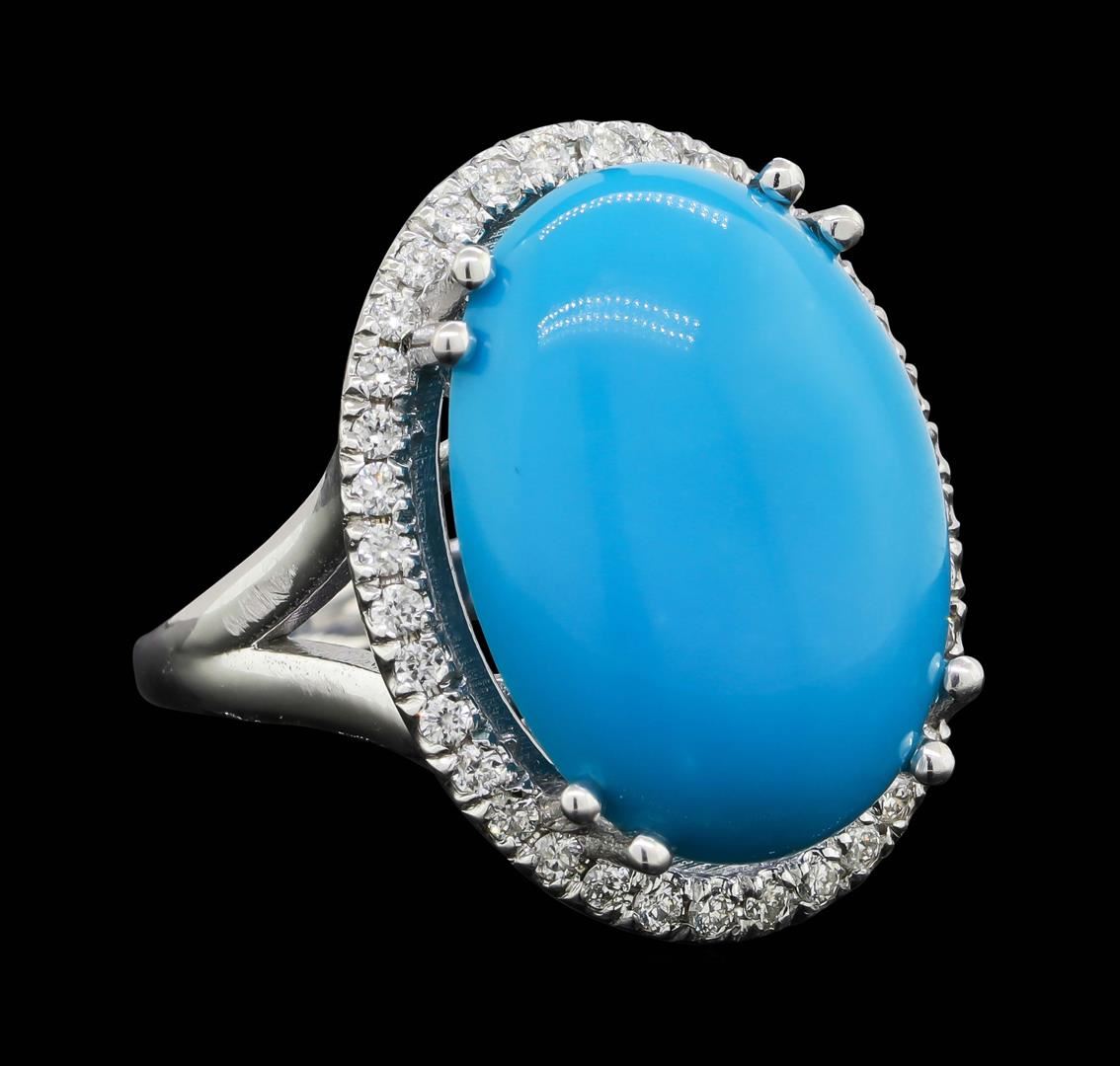 One electronically tested 14KT white gold lady's cast fashion ring with a split shank halo with a bright polish finish. The featured lady's ring has a shank measuring 2.06 millimeters wide. Identified with markings of "14K". Condition is new, good workmanship. Containing: One prong set oval cabochon cut natural turquoise, measuring 18.15 x 13.20 x 4.45mm, (depth est.) approximate weight of 8.18ct., medium, strong, green blue color, (GIA GB 5/5), cut is very good. Colored gemstones are presumed to have been subjected to commonly used enhancement processes. Graded in the setting. Thirty-Six prong set round brilliant cut diamonds, measuring 1.40 - 1.30 x 0.81mm (depth est.) approximate total weight of 36 Stones = 0.33ct. Graded in the setting. Clarity: SI-1 to SI-2. Color: H - ICut Good. Total Weight of Colored Stones 8.18ct. Total Weight of Diamonds 0.33ct. Total Weight of Ring 6.70gm. GAS Appraised.