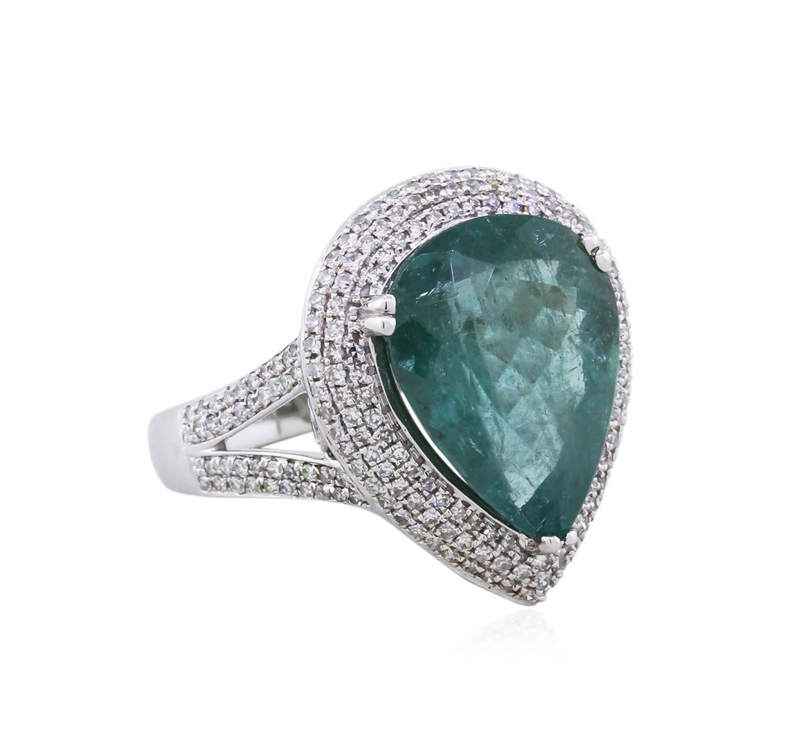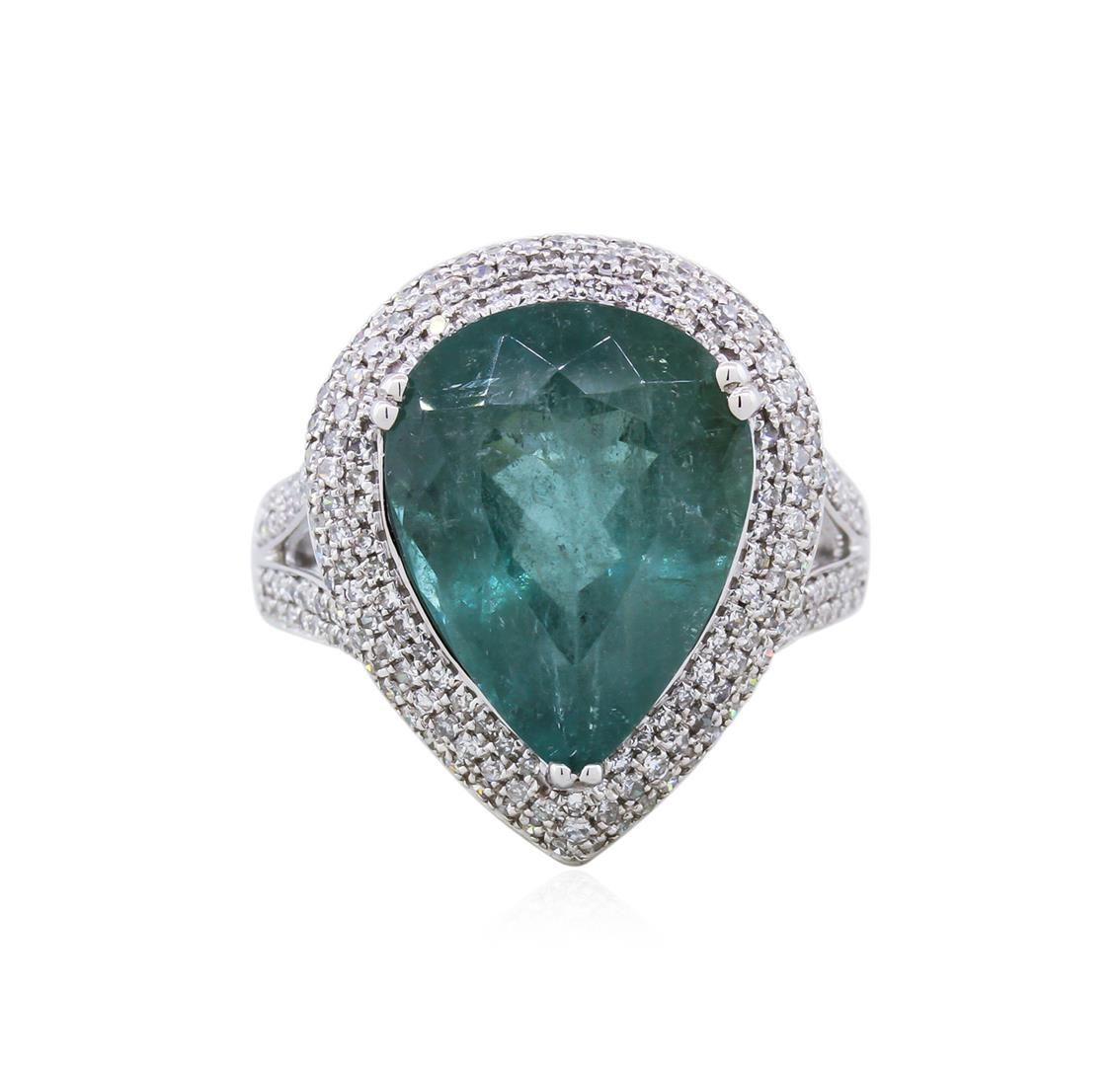 Elegant green tourmaline and diamond ring set in 14KT white gold weighing 5.95 grams containing a 8.23 carat green tourmaline center stone showcased by two hundred and thirty-six round diamonds that extend down both sides of the band with a total weight of 0.87cts.