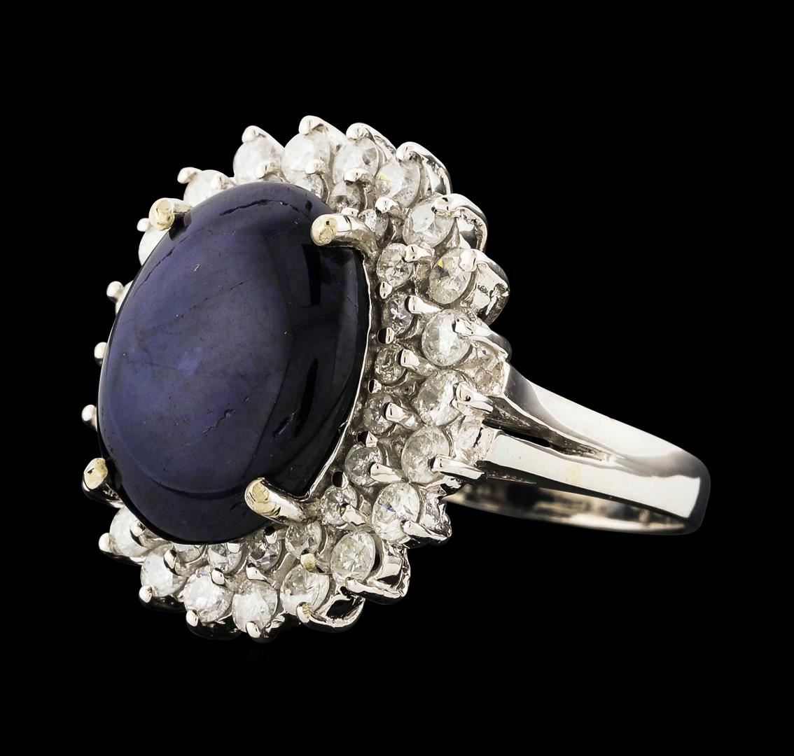 One electronically tested 14KT white gold ladies cast blue star sapphire and diamond ring with a bright polish finish. The featured blue star sapphire is set within two tiered diamond bezels, completed by a two millimeter wide band. Identified with markings of "K14". Condition is new, good workmanship. Containing: One prong set oval cabochon cut natural blue star sapphire, measuring 14.50 x 11.80 x 4.05mm, 10%. bulge factor, approximate weight of 8.24ct., dark, very slightly grayish, violetish blue color, (GIA vB 7/3), cut is good. This stone has a mostly complete six ray star with strong intensity and good movement. Transmitting light very diffusely, opaque. Naturally occurring internal & external characteristics are present. Indications of multiple laboratory enhancements, including high temperature diffusion treatment. Graded in the setting. Forty-Four prong set round brilliant cut diamonds approximate total weight of 44 Stones = 1.57ct. Graded in the setting. Clarity: I-1 to I-3. Color: H - J. Total Weight of Colored Stones 8.24ct. Total Weight of Diamonds 1.57ct. Total Weight of Ring 8.14gm. AIG Appraised at $6,220.00.